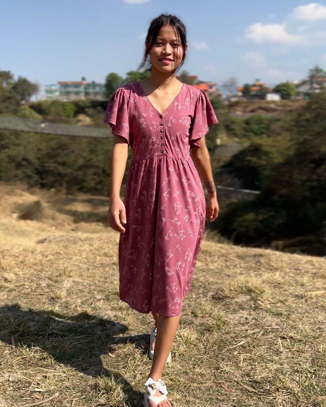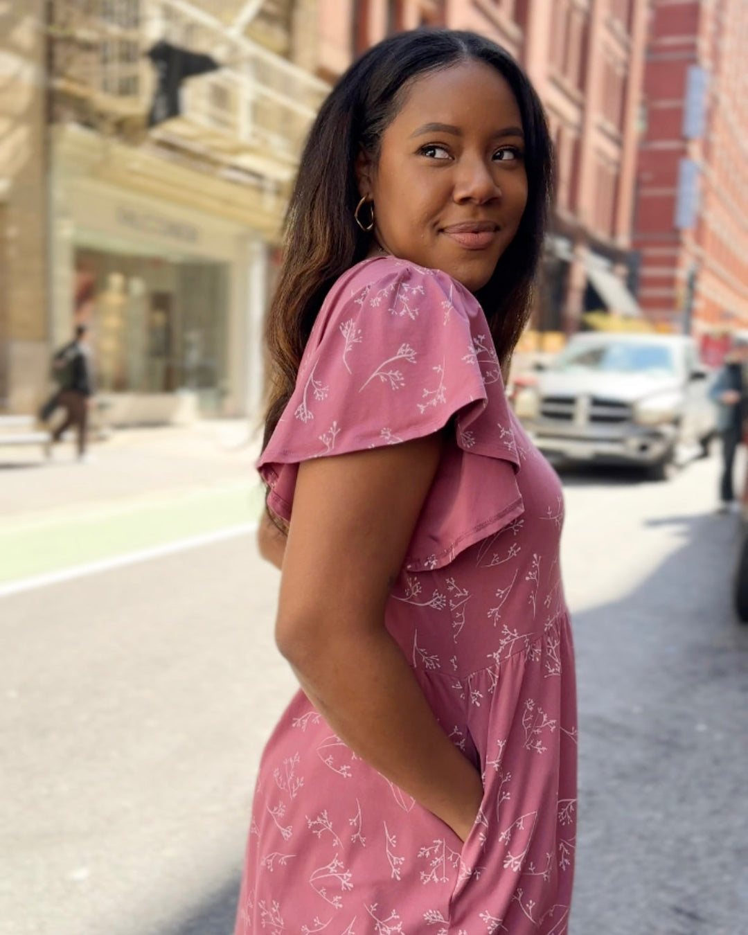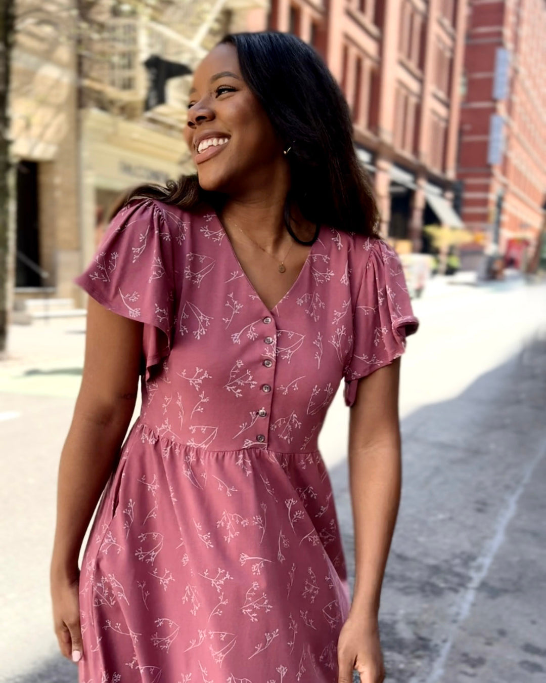 This elegant dress features a nursing-friendly design with functional tortoise shell buttons. The fluttery sleeves add sophistication while the fitted style allows for gentle movement around the hip. Get ready to conquer the day in style and comfort!
