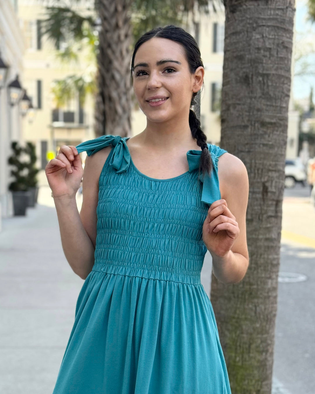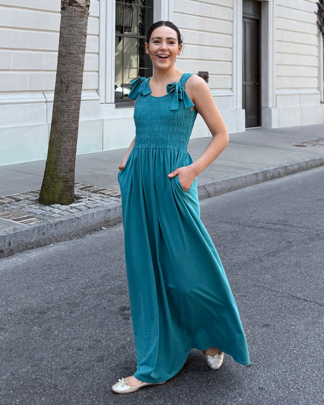 This maxi dress is for every season and occasion. The ties are removable and can be tied into a bow, or just on one side for an asymmetrical look. Without the ties, the wider shoulder of the smocked bodice makes the dress more casual, and it can easily layer under cardigans. Pockets are hidden in the side seams.