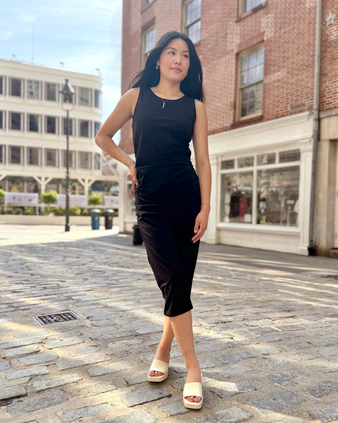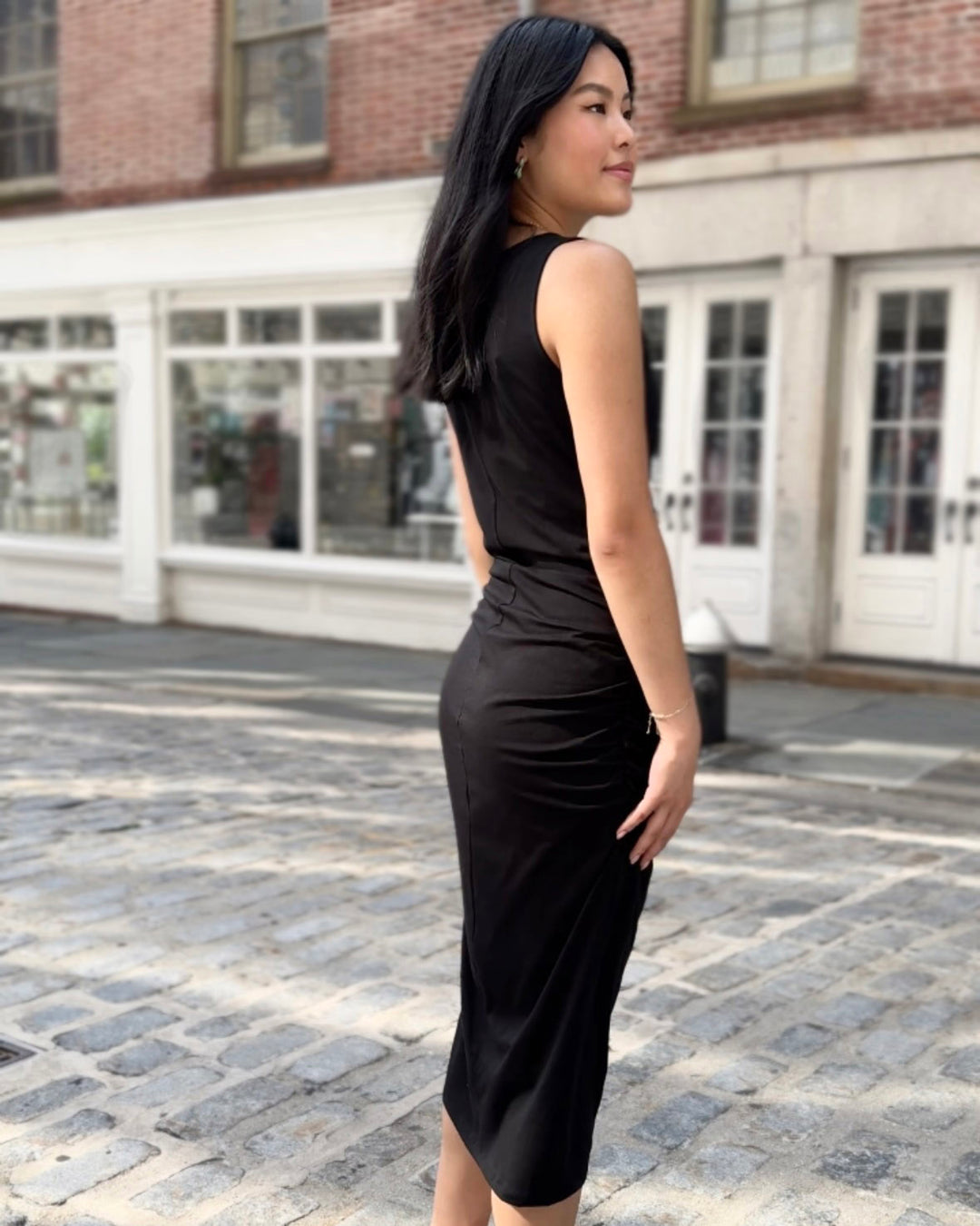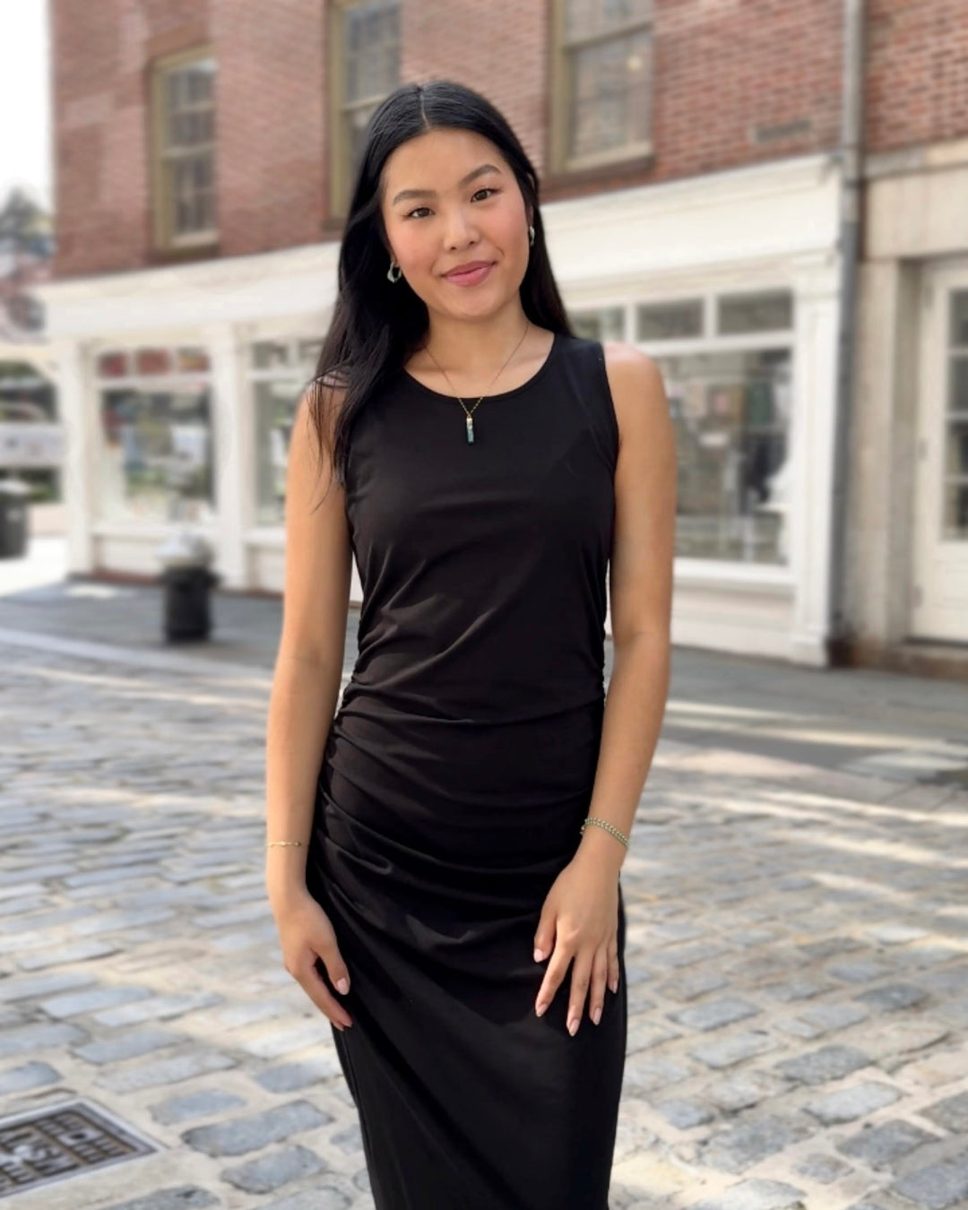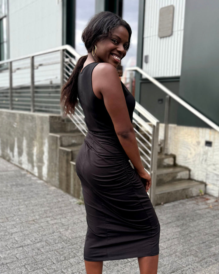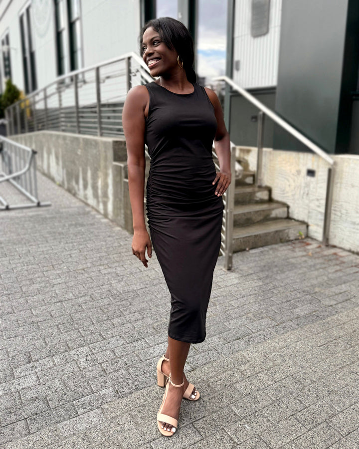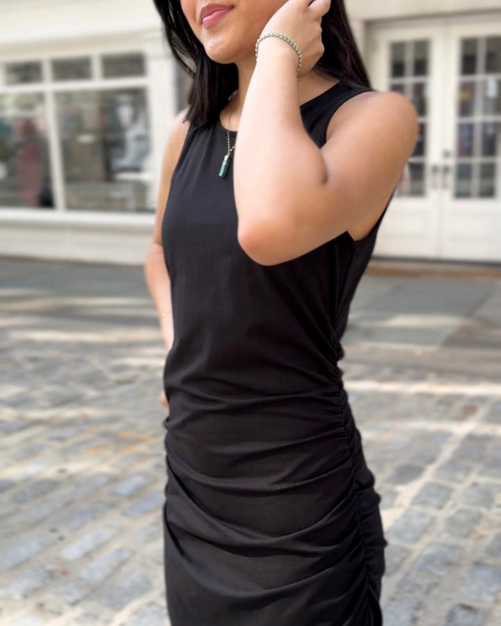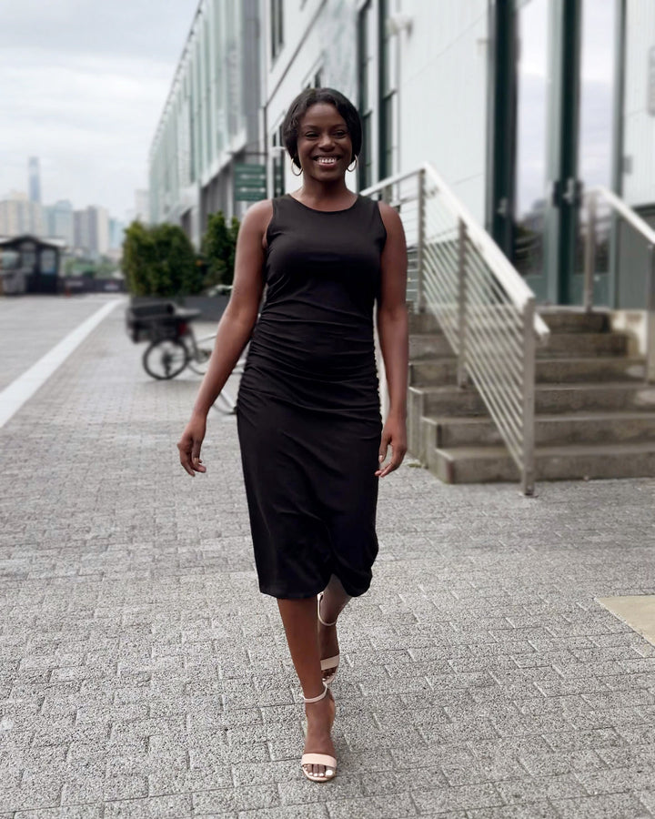 This ruched dress is chic with your favorite pair of boots, or more casual with sneakers. The gathered side seams keep the dress from feeling too snug.