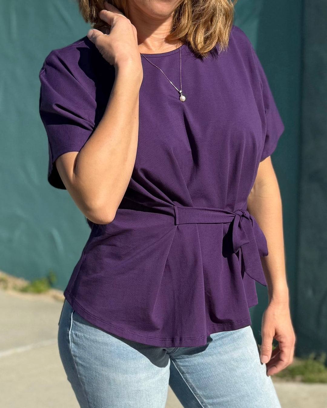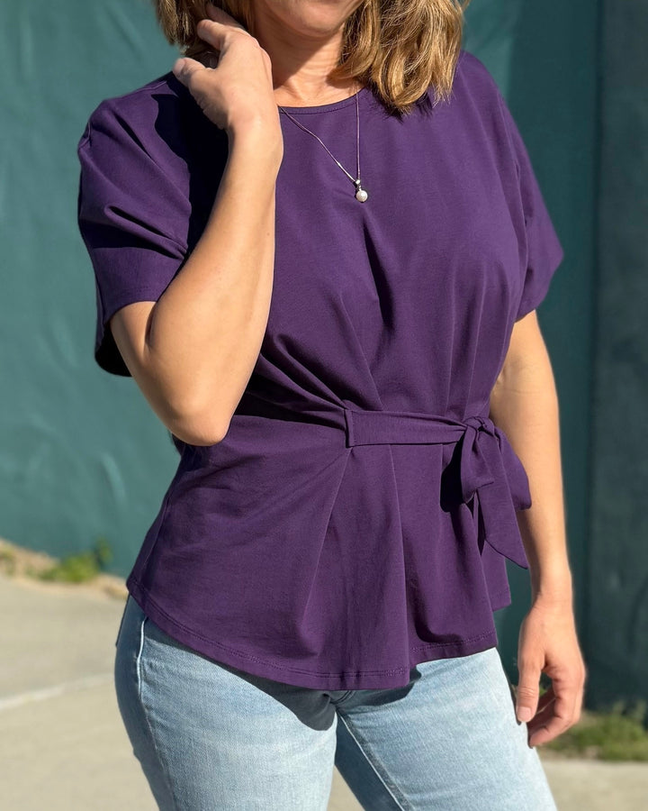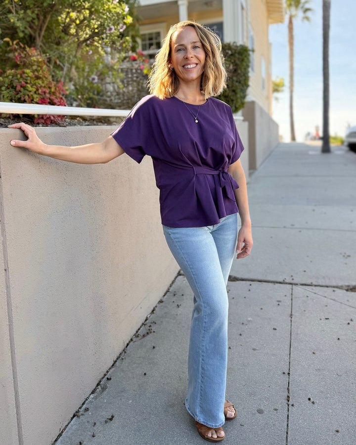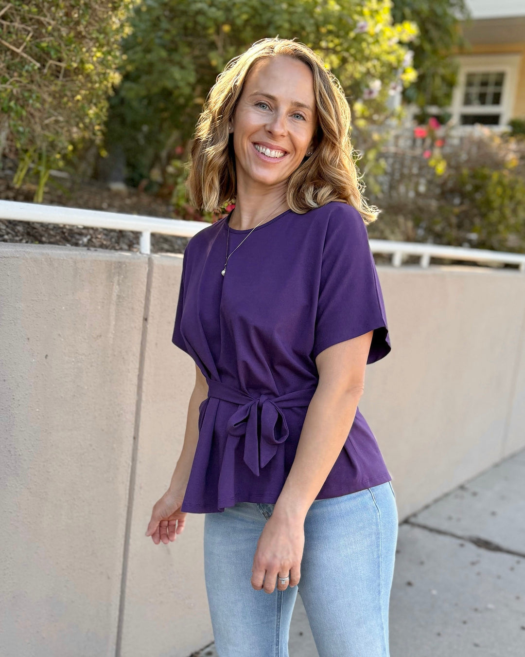 This elegant tee is the blend of comfort and style. With dolman short sleeves and a boxy fit, this top offers a flattering silhouette. The attached tie creates waist definition without feeling restricted.