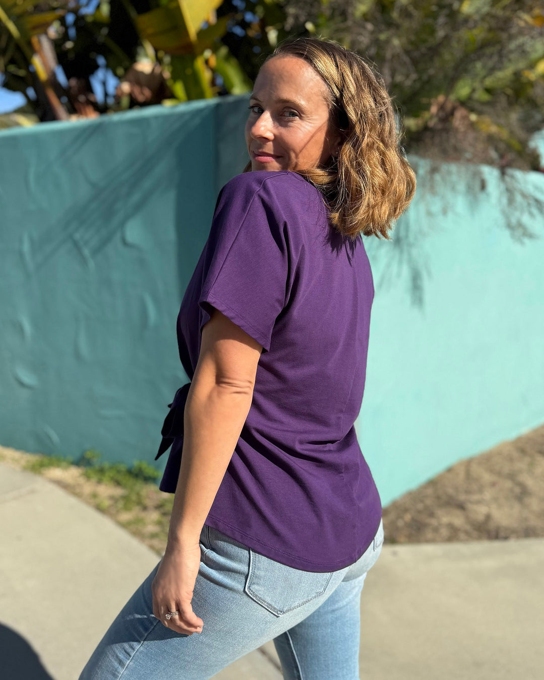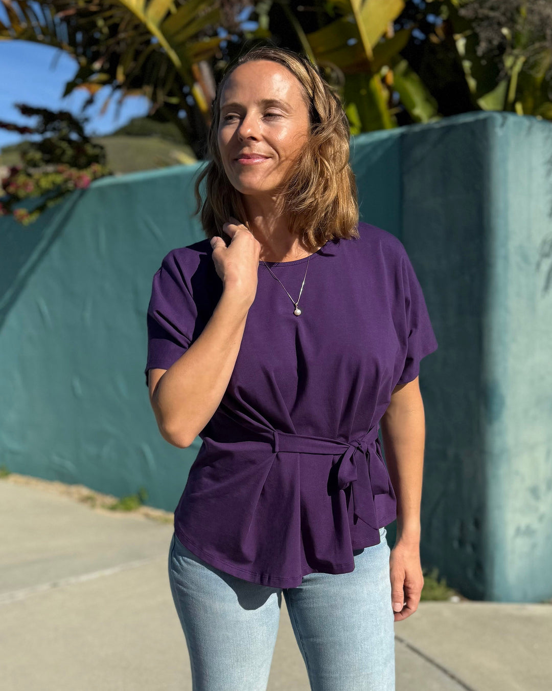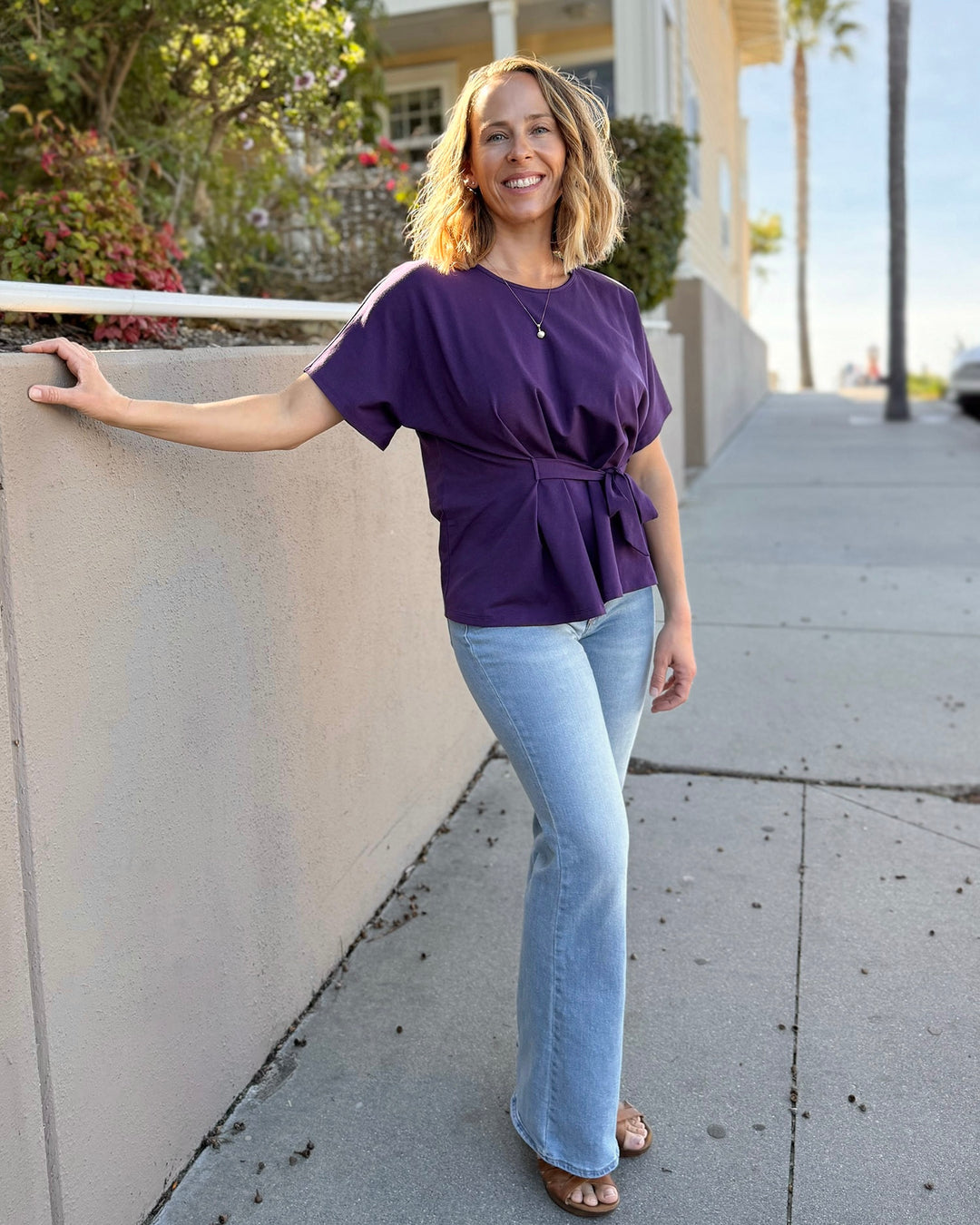 This elegant tee is the blend of comfort and style. With dolman short sleeves and a boxy fit, this top offers a flattering silhouette. The attached tie creates waist definition without feeling restricted.