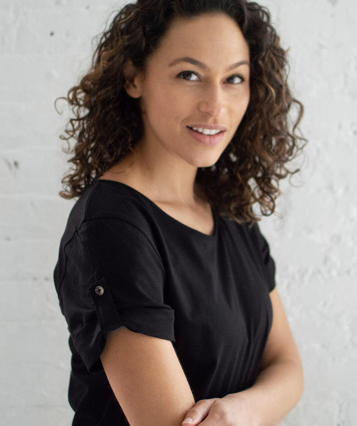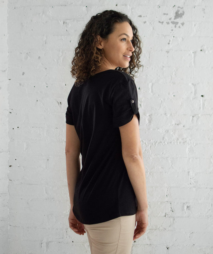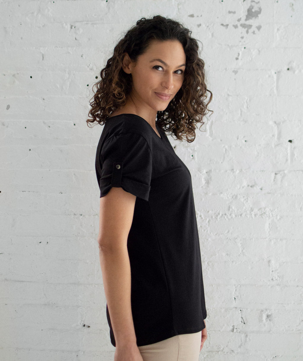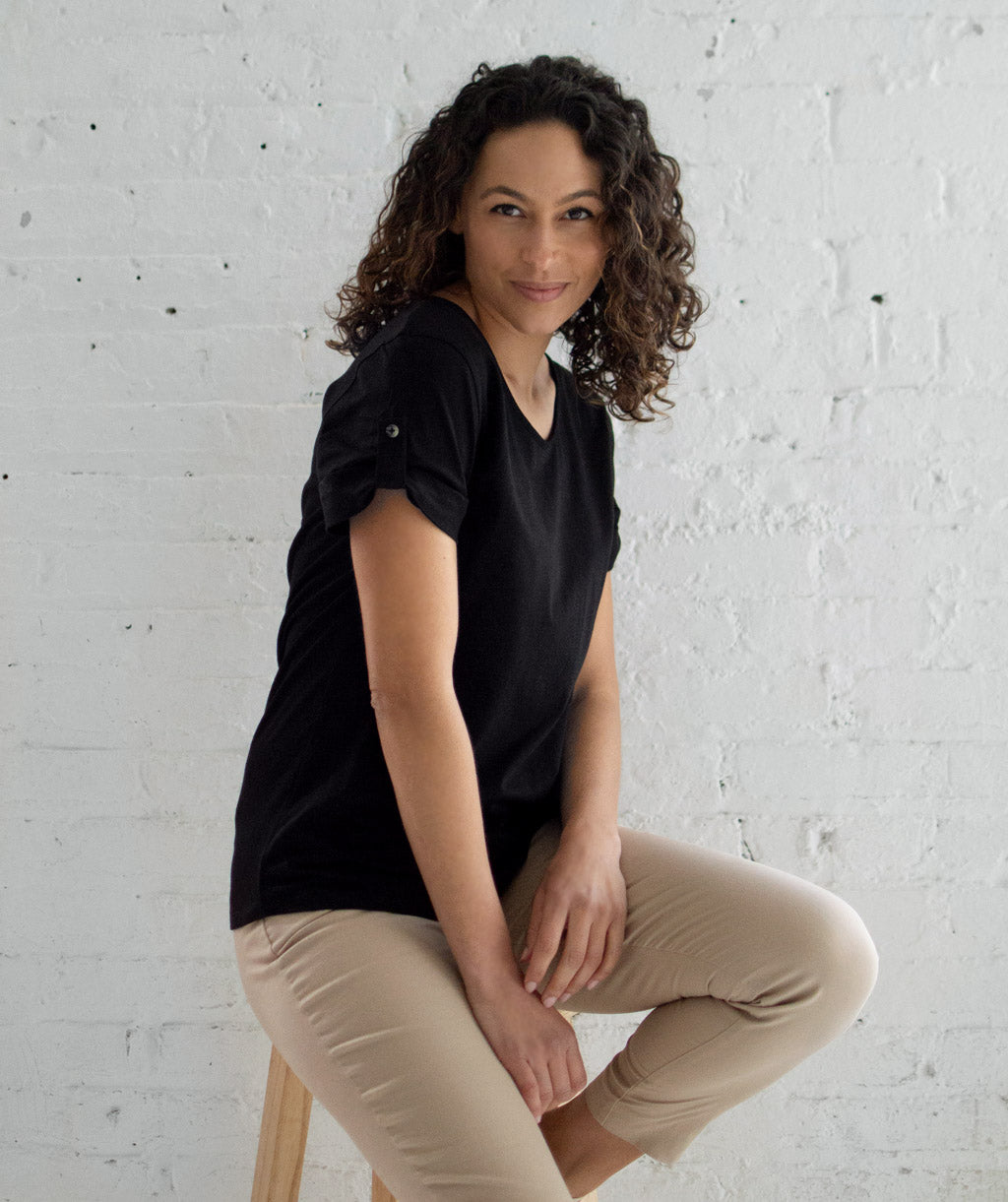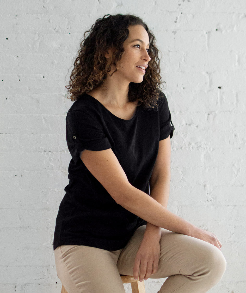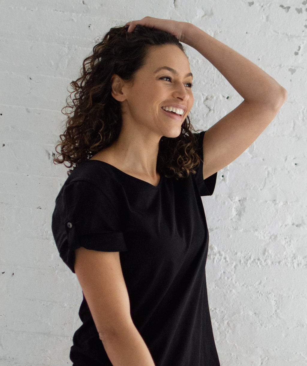 • Don't overthink it.  We have a low return rate overall because most designs are flattering in a size up or down. Our knit fabrics drape in all the right ways!