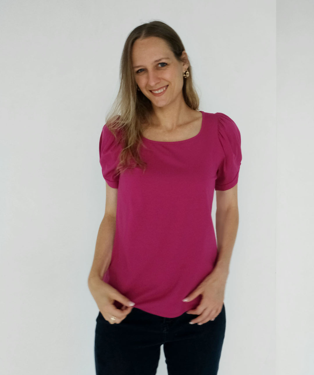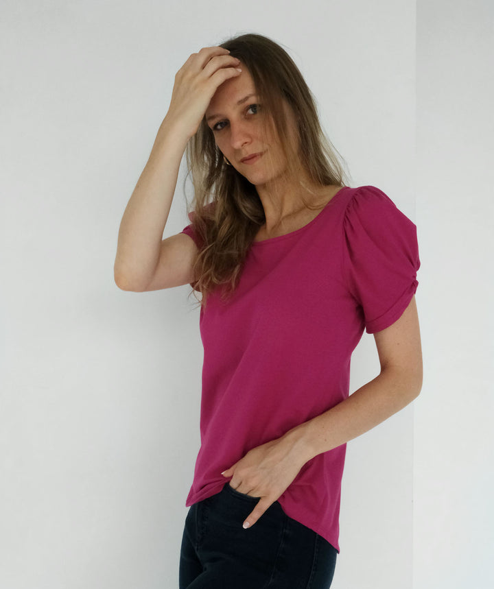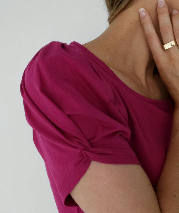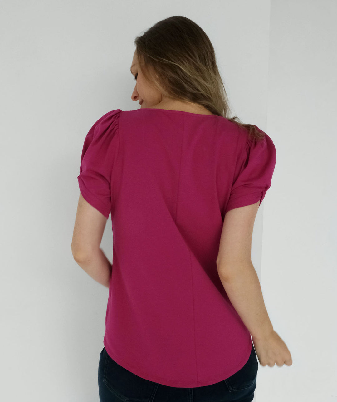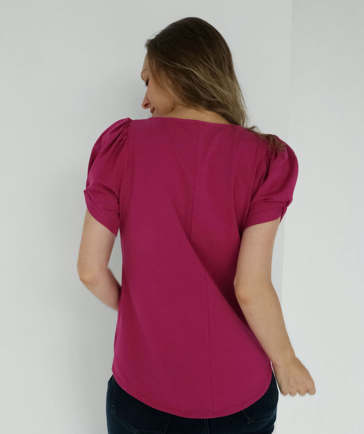 - The rounded square neckline makes a soft statement with a bold puffed sleeve.