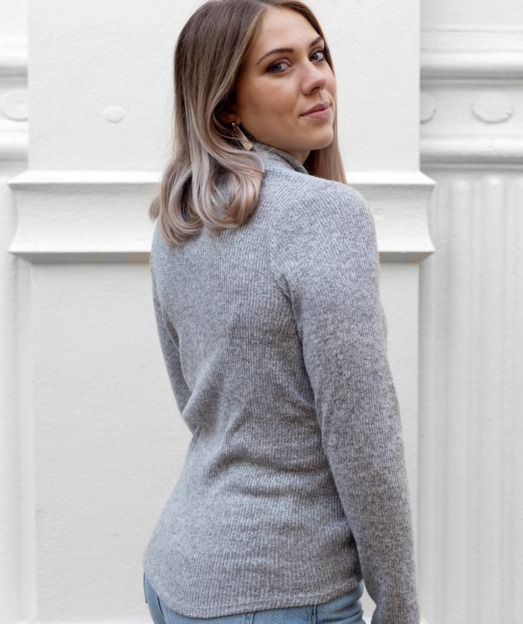 Soft sweater-like rib knit fabric in a cozy layering piece.