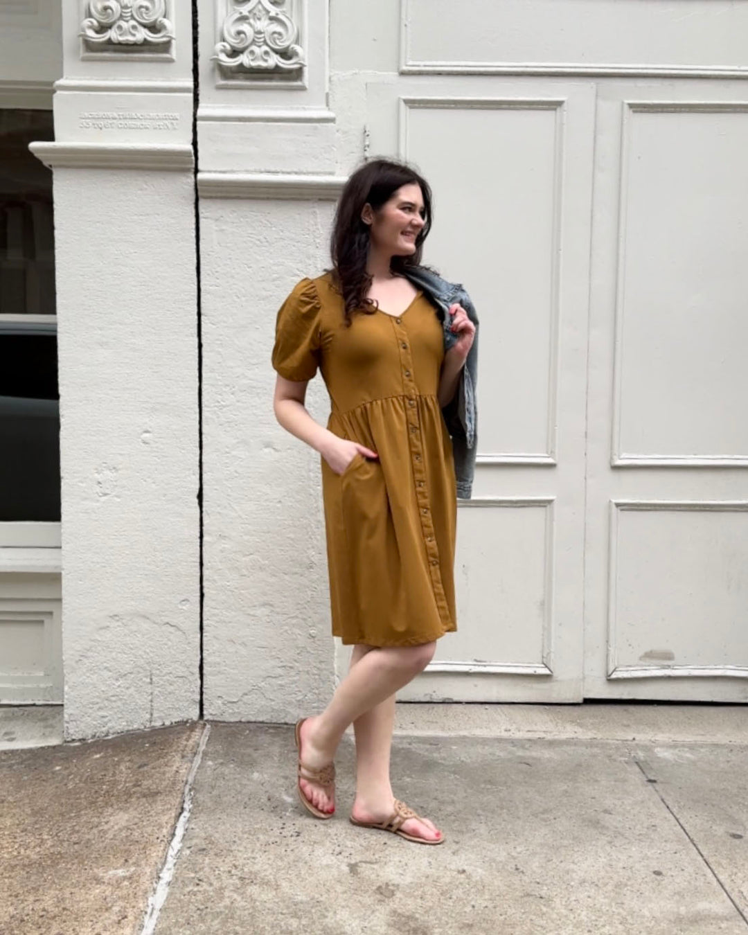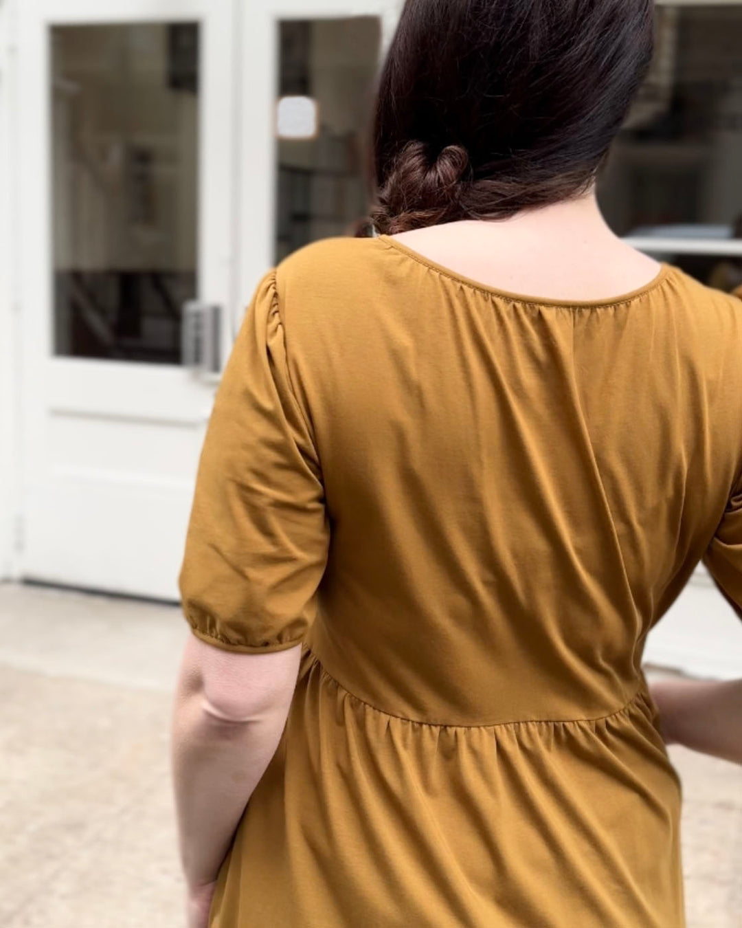 • Don't overthink it.  We have a low return rate overall because most designs are flattering in a size up or down. Our knit fabrics drape in all the right ways!