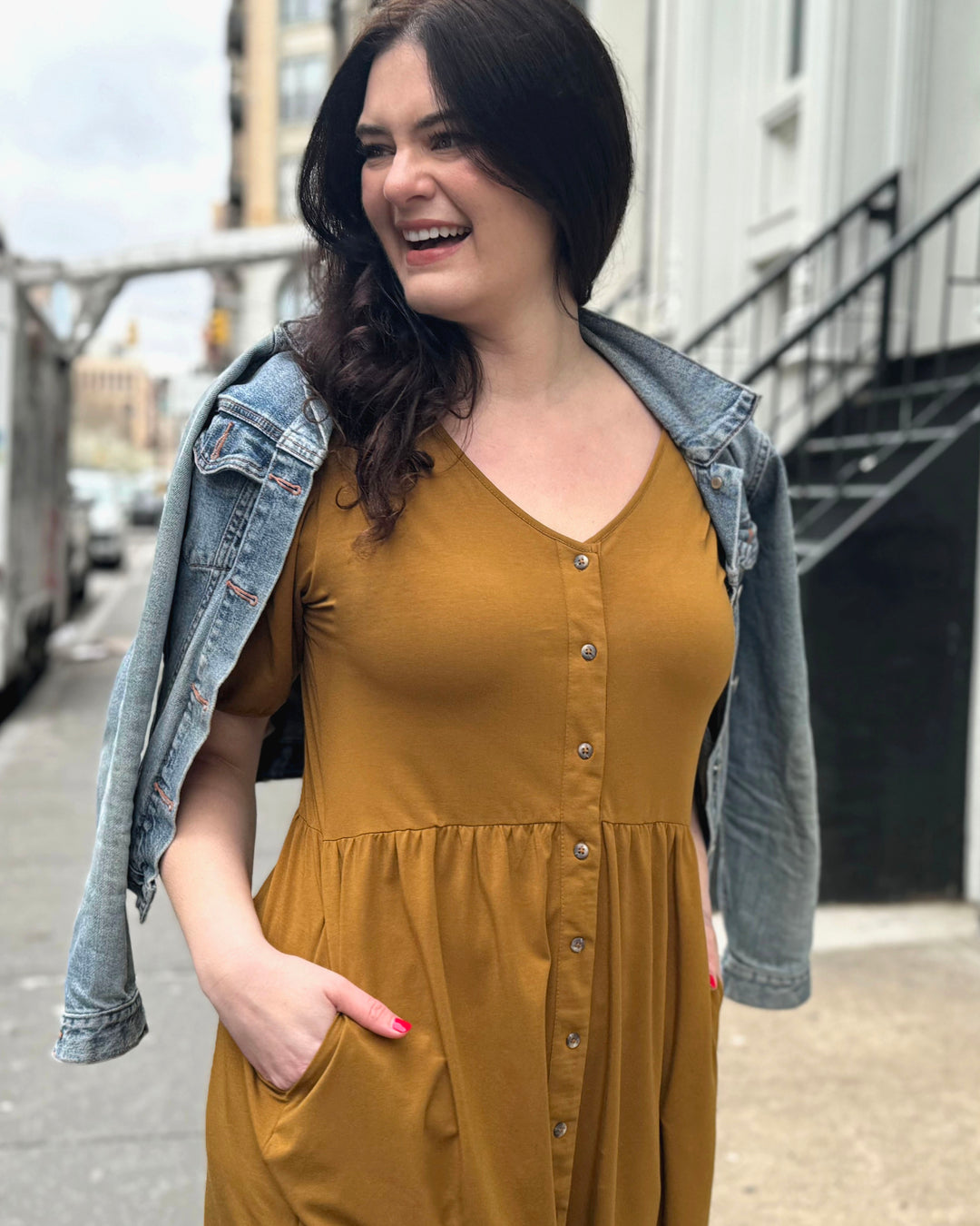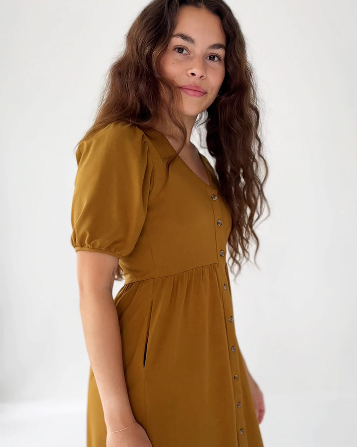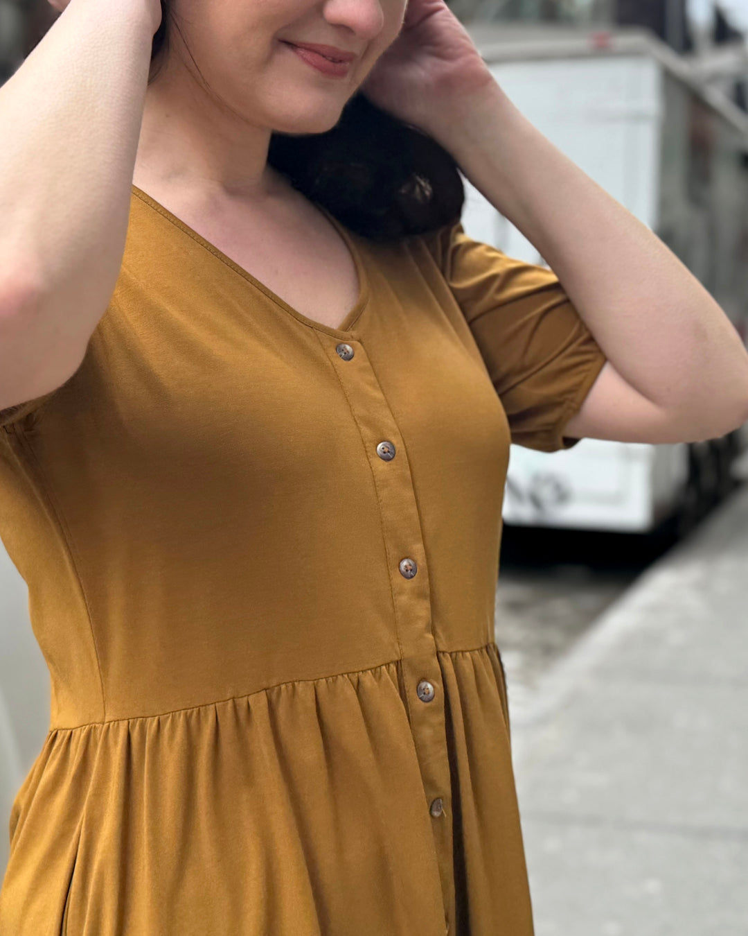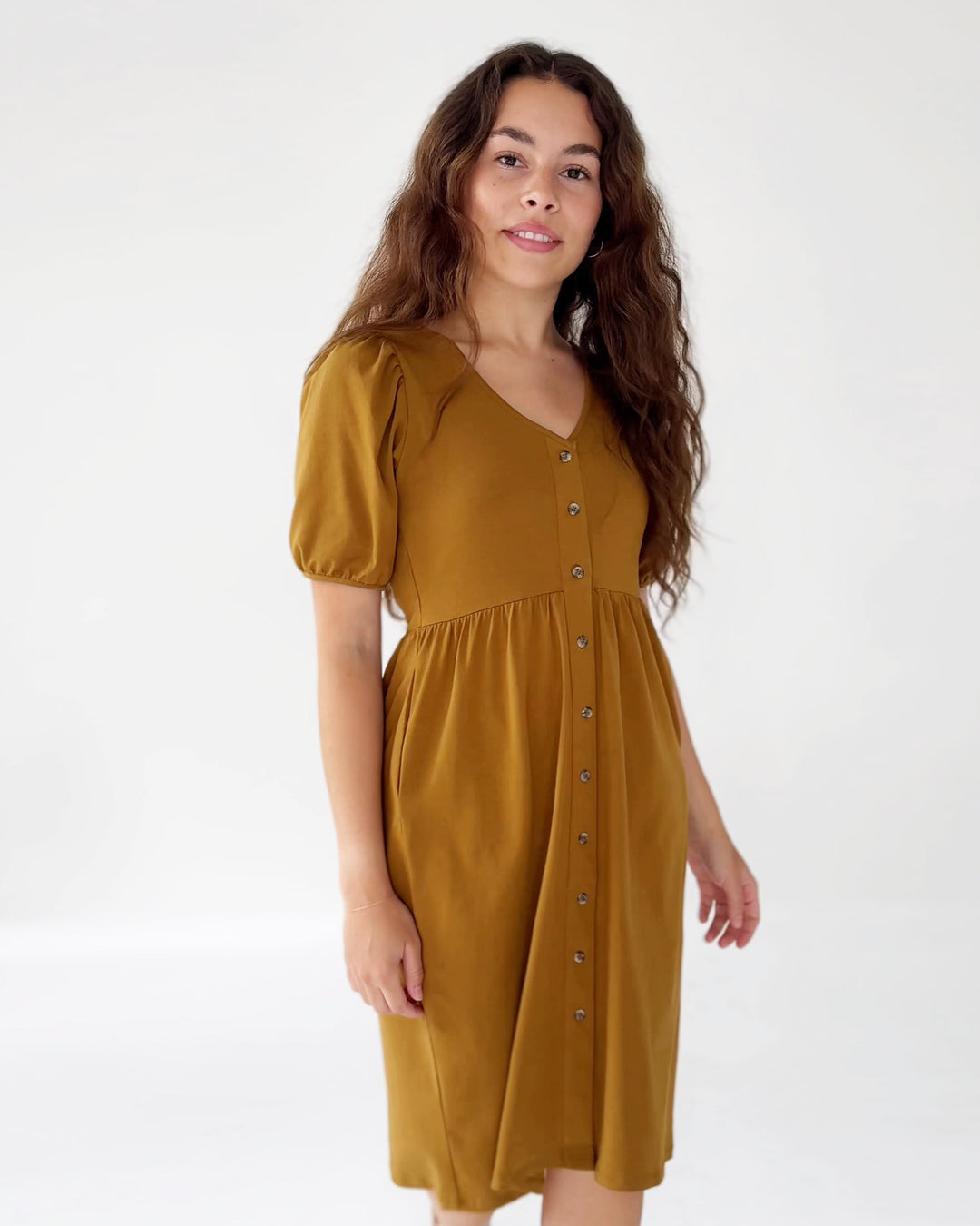 Perfect for nursing moms, this dress features convenient buttons, pockets for storing small essentials, and a flattering fit and flare cut. Enjoy arm coverage and a comfortable stretchy sleeve hem while looking elegantly stylish.