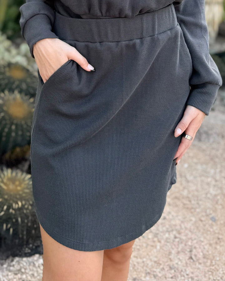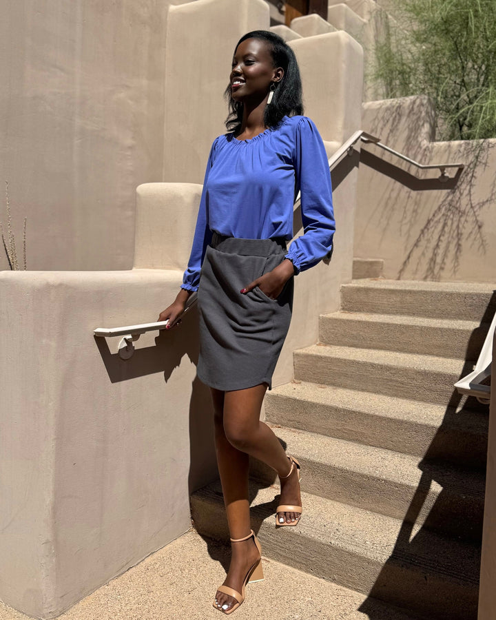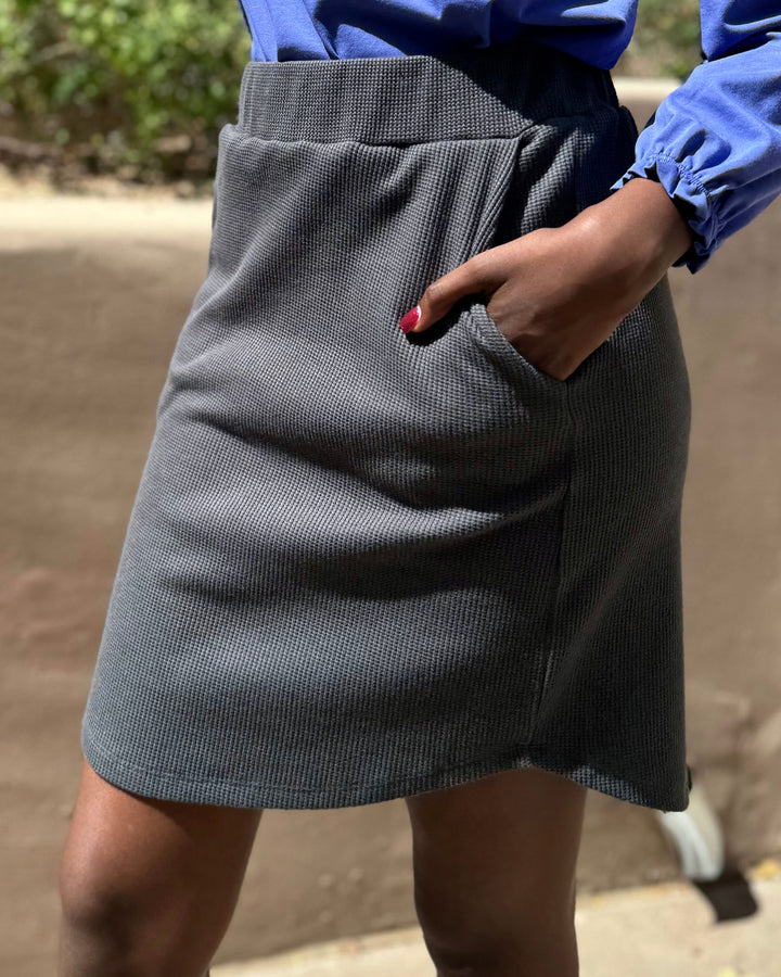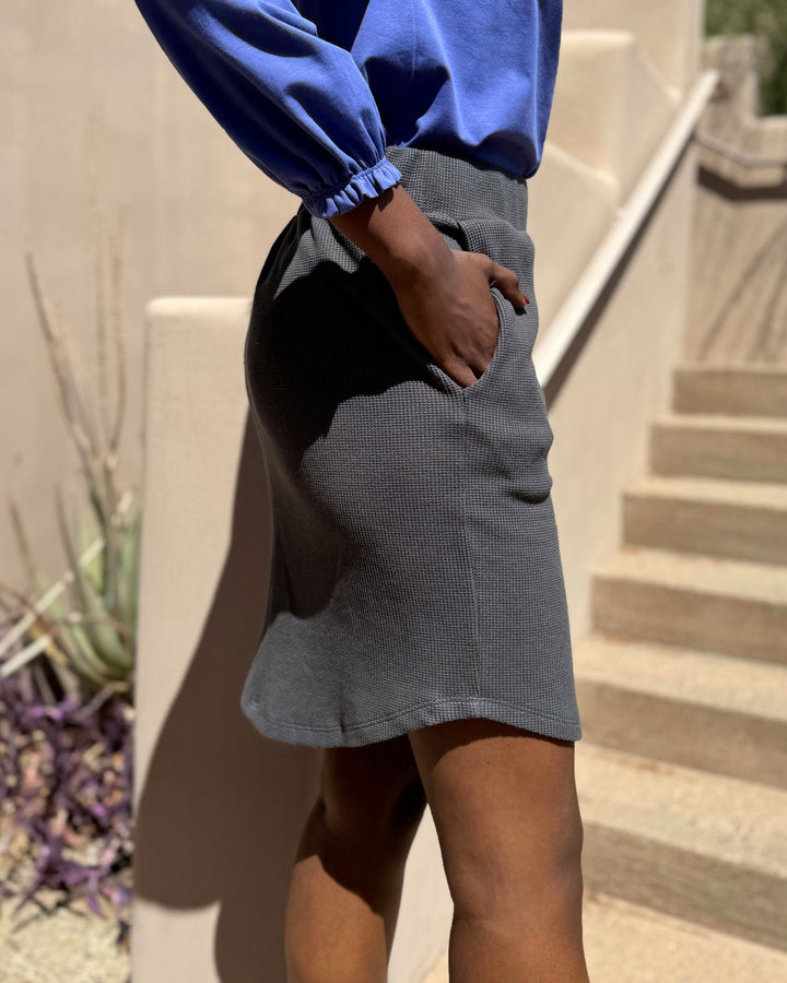 The Lotus skirt is designed to flatter your figure with its curved hem. The flat front pockets will not add bulk to your hips, while the elastic waistband stays in place thanks to a special stitch. Look stylish and feel supported in this approachable and comfortable skirt.