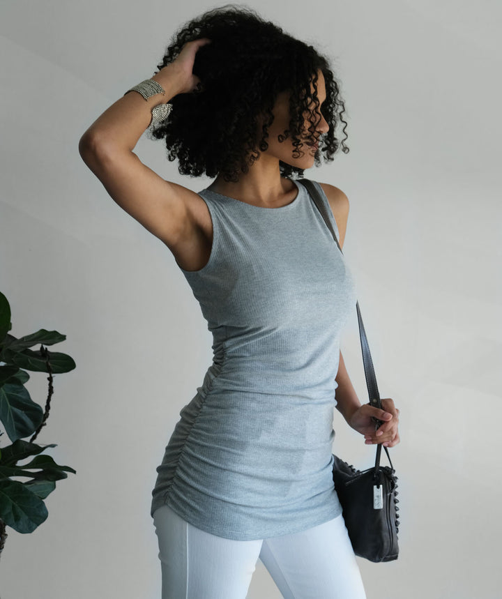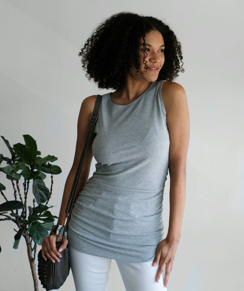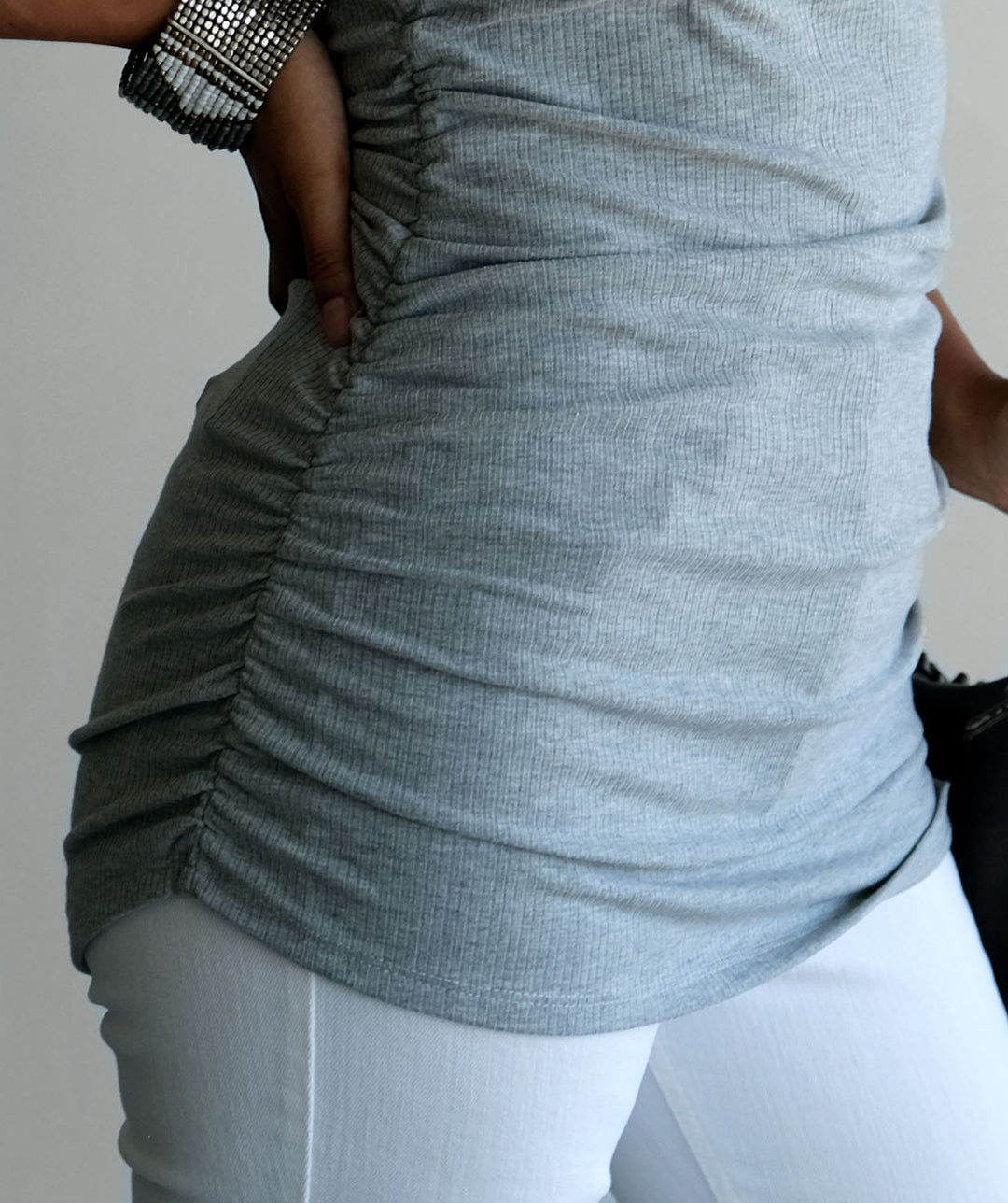 - In rib knit fabric, this tunic is made to pop your curves. The gathered side seams keep the tunic from accentuating too much.