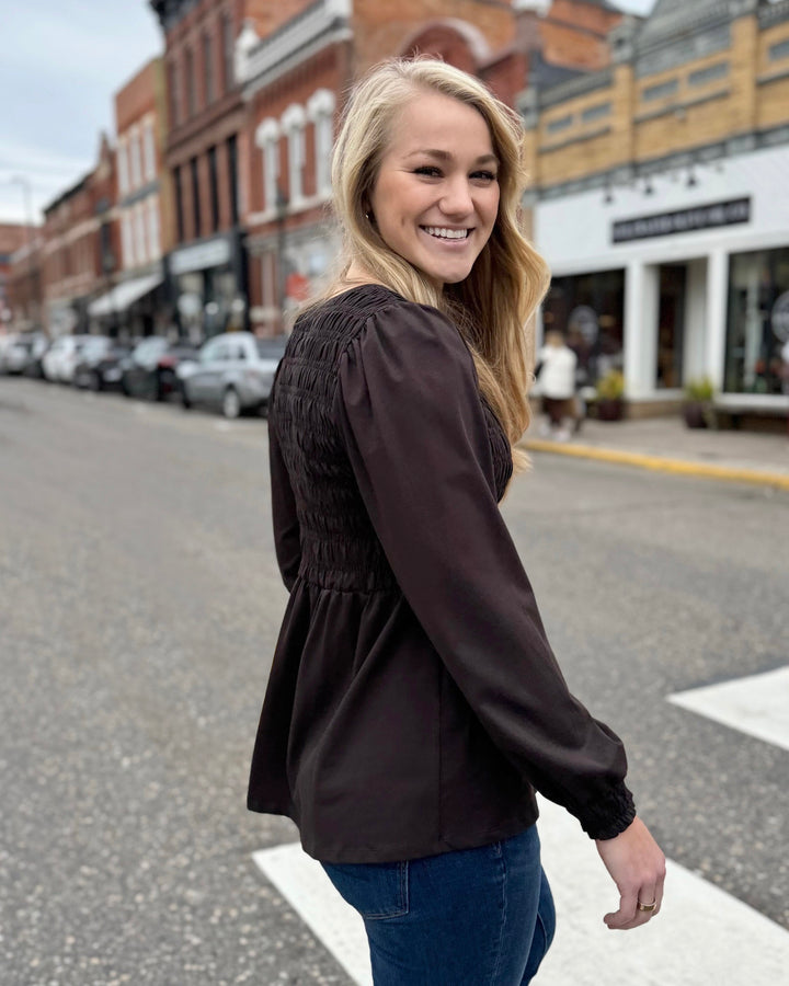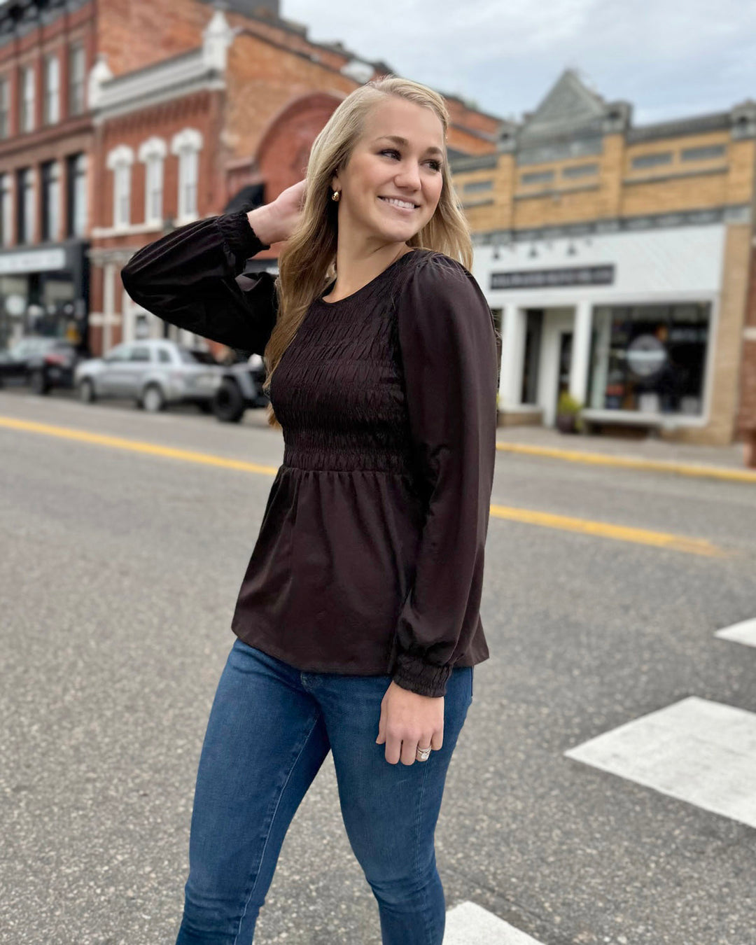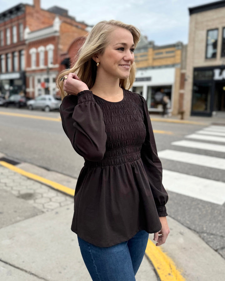 Make a statement in this comfortable top. Its stretchy fabric flatters your figure, with elegant smocking detailing that smooths, and a peplum that shapes.