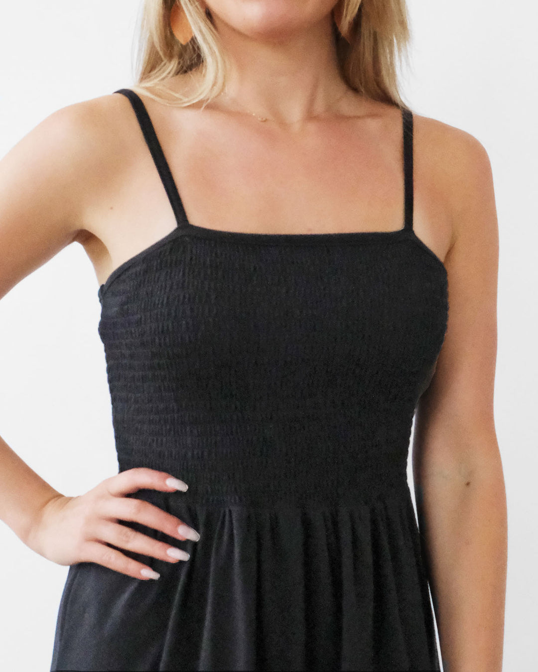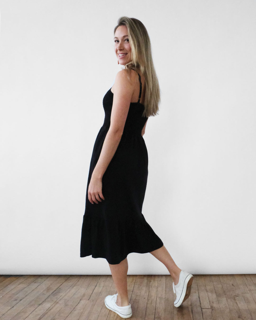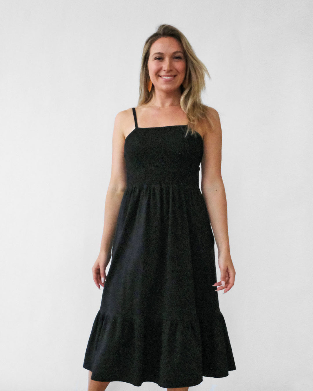 • Fitted in the bust and waist to contour to your torso. The smocking has a forgiving stretch.