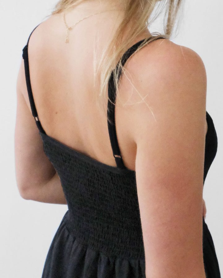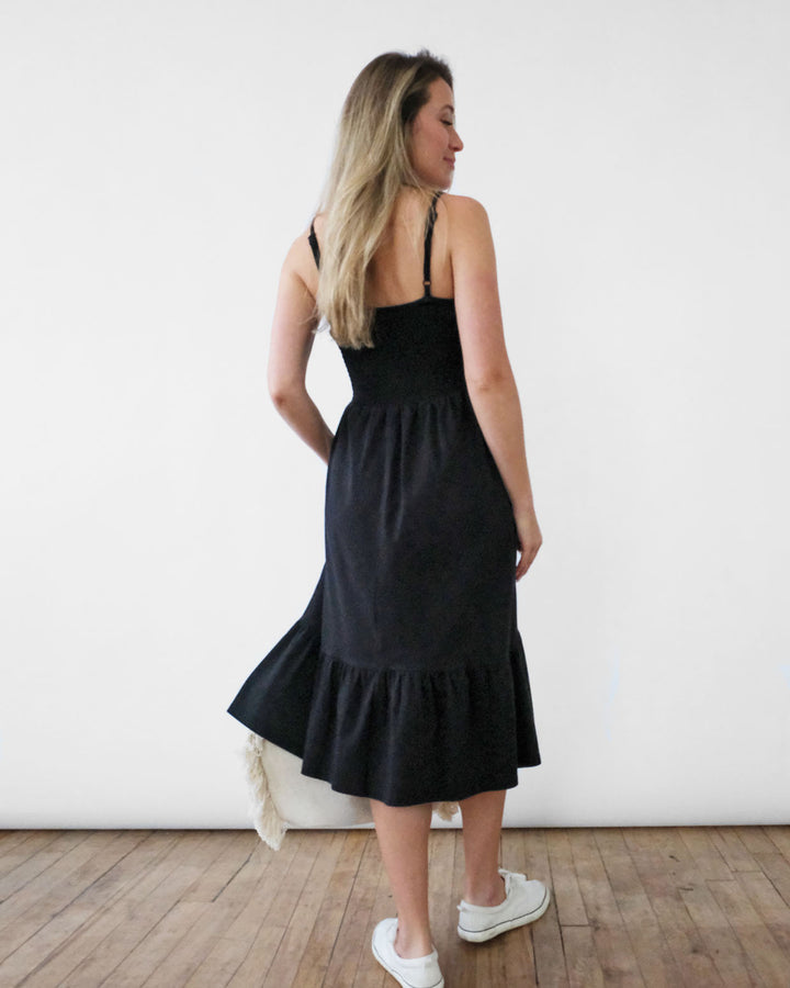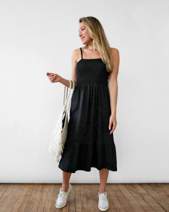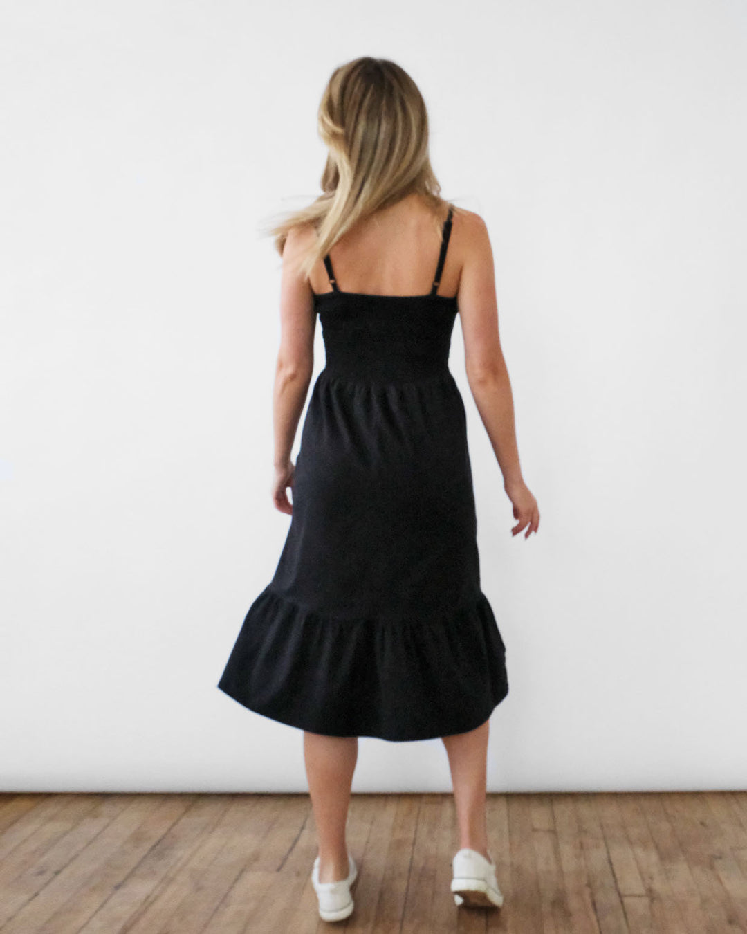 • Fitted in the bust and waist to contour to your torso. The smocking has a forgiving stretch.