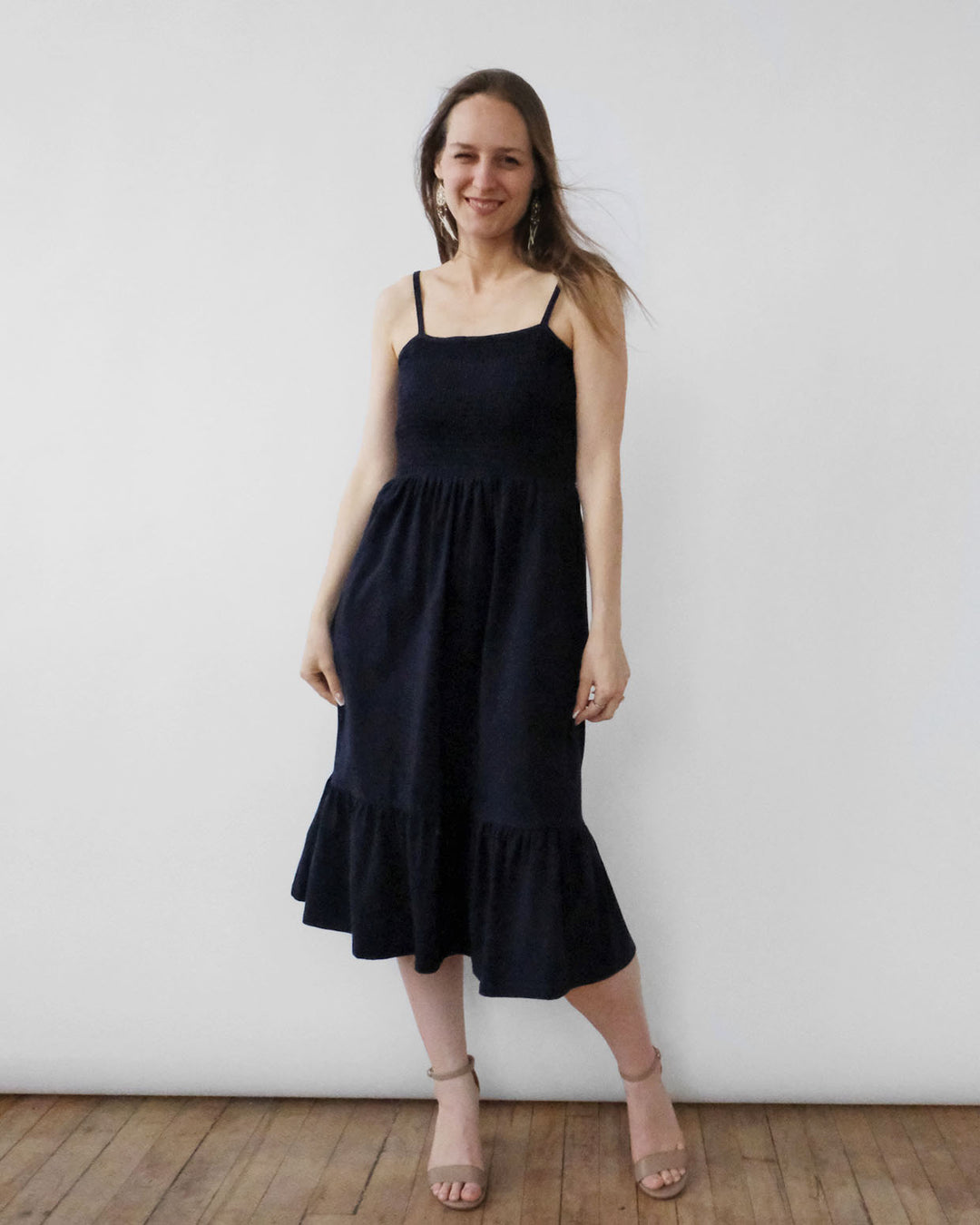 - Fitted in the bust and waist to contour to your torso. The smocking has a forgiving stretch.