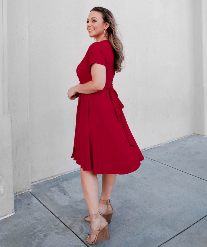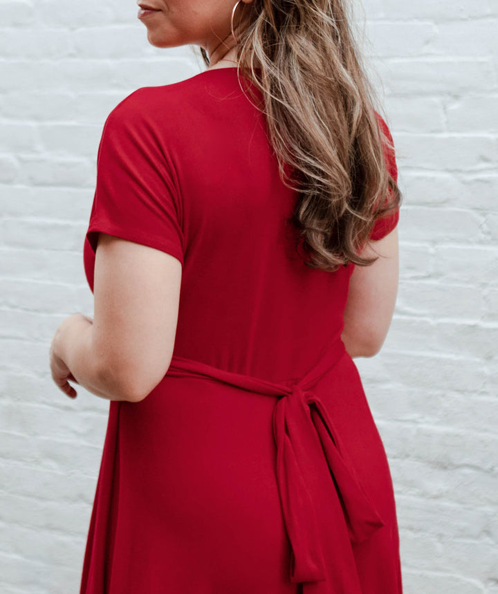 - A true wrap dress with a tie that slides through a small hole on wearer's left side.