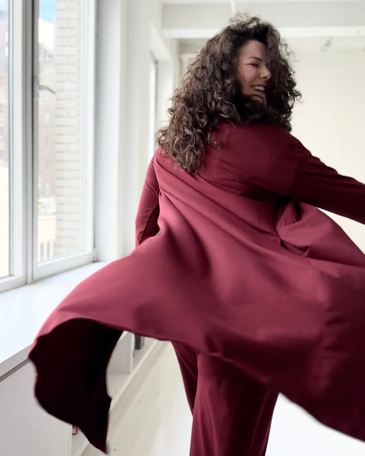The Merritt duster is so versatile that it can be worn for a nap or an elegant event. The favorite feature is the pockets hidden in the side seams.