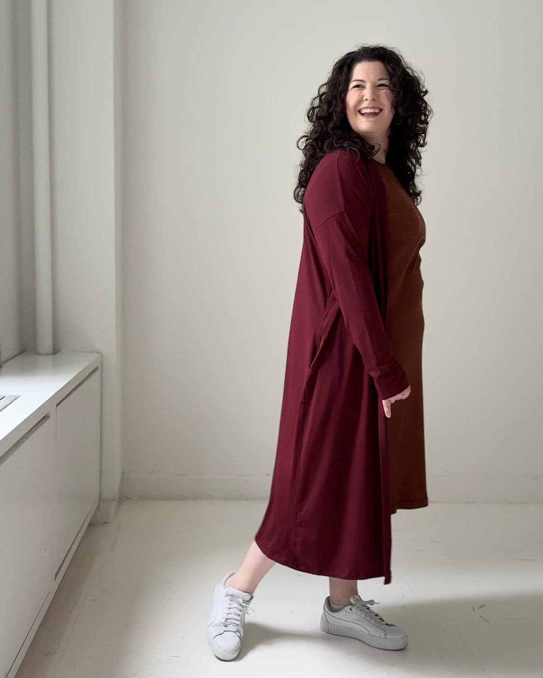 • Don't overthink it.  We have a low return rate overall because most designs are flattering in a size up or down. Our knit fabrics drape in all the right ways!