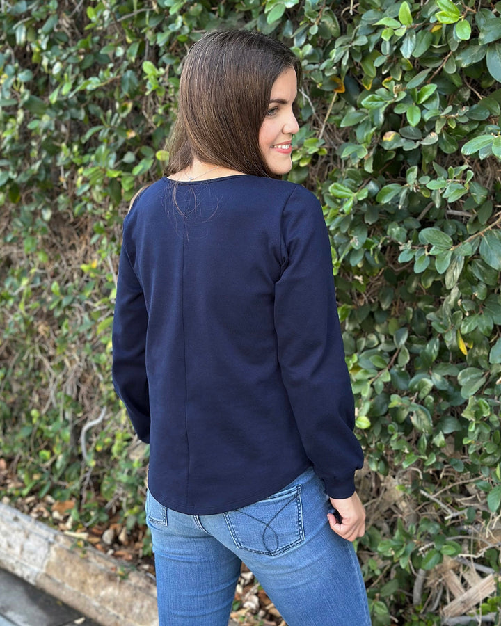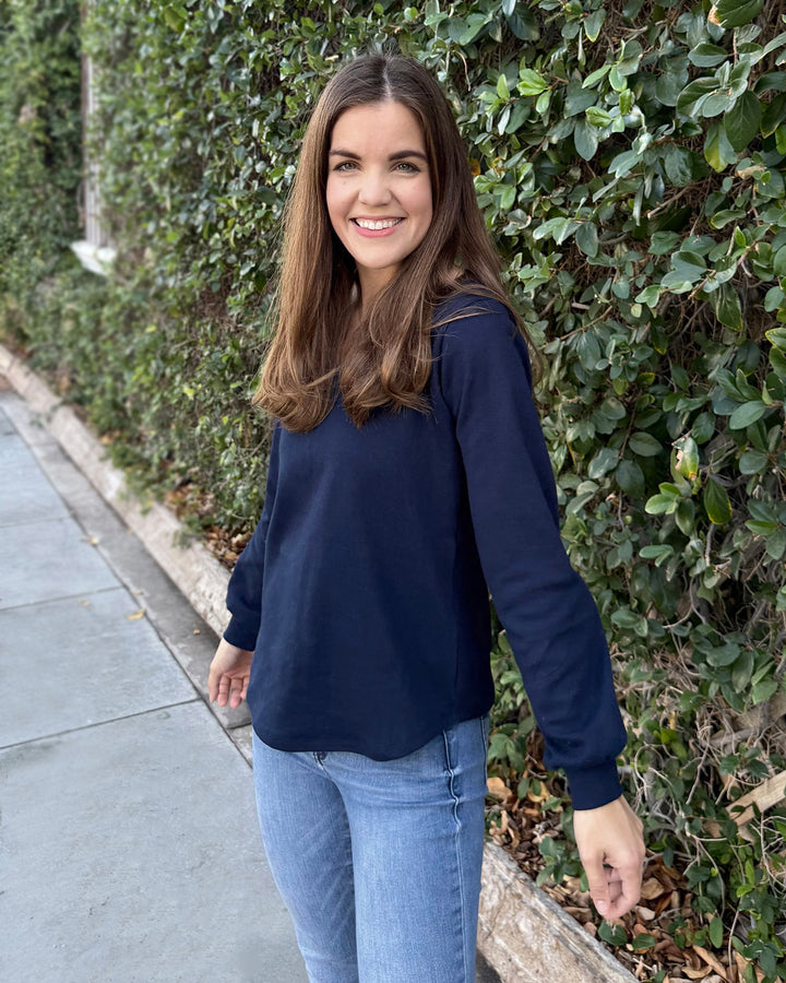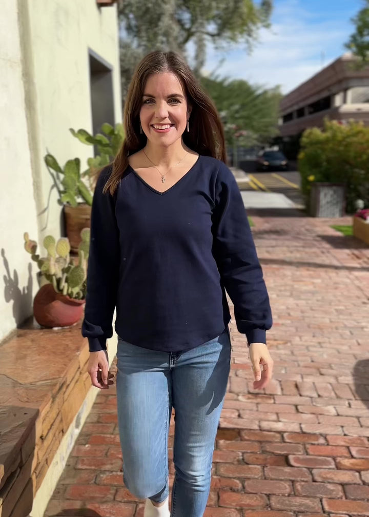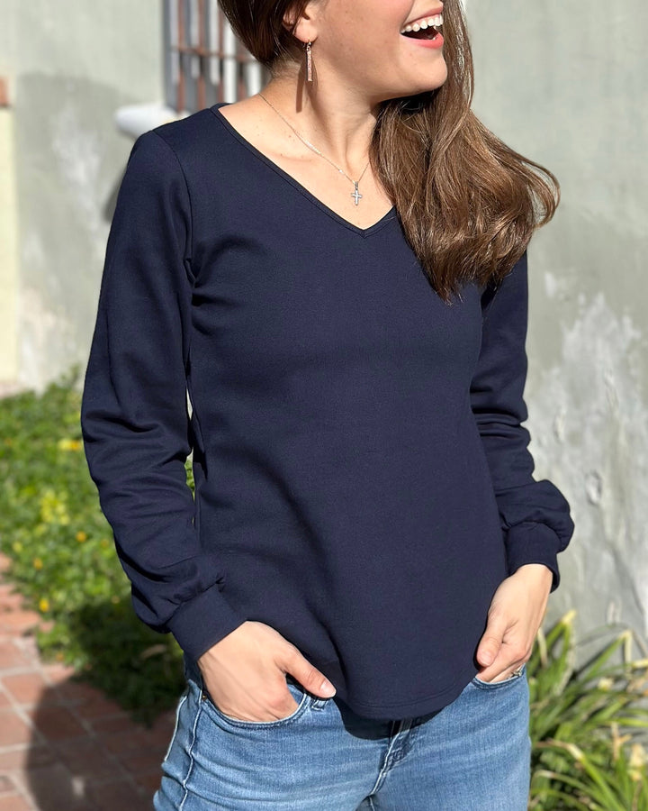 This perfect basic piece has a v-neck and long sleeves, with a boxy fit. Made with thicker fabric, it's the perfect transition piece for in between seasons.