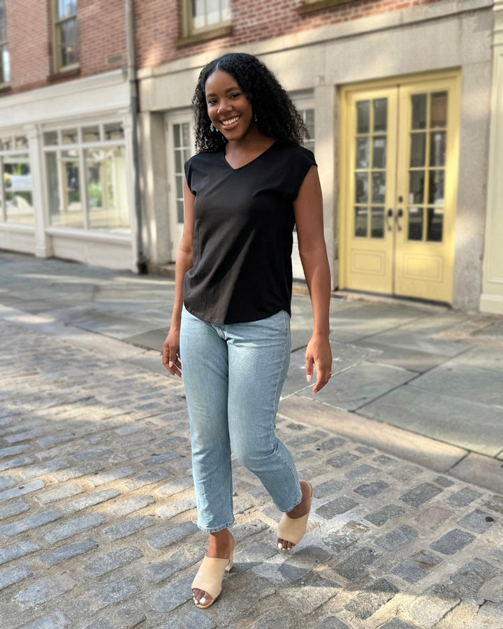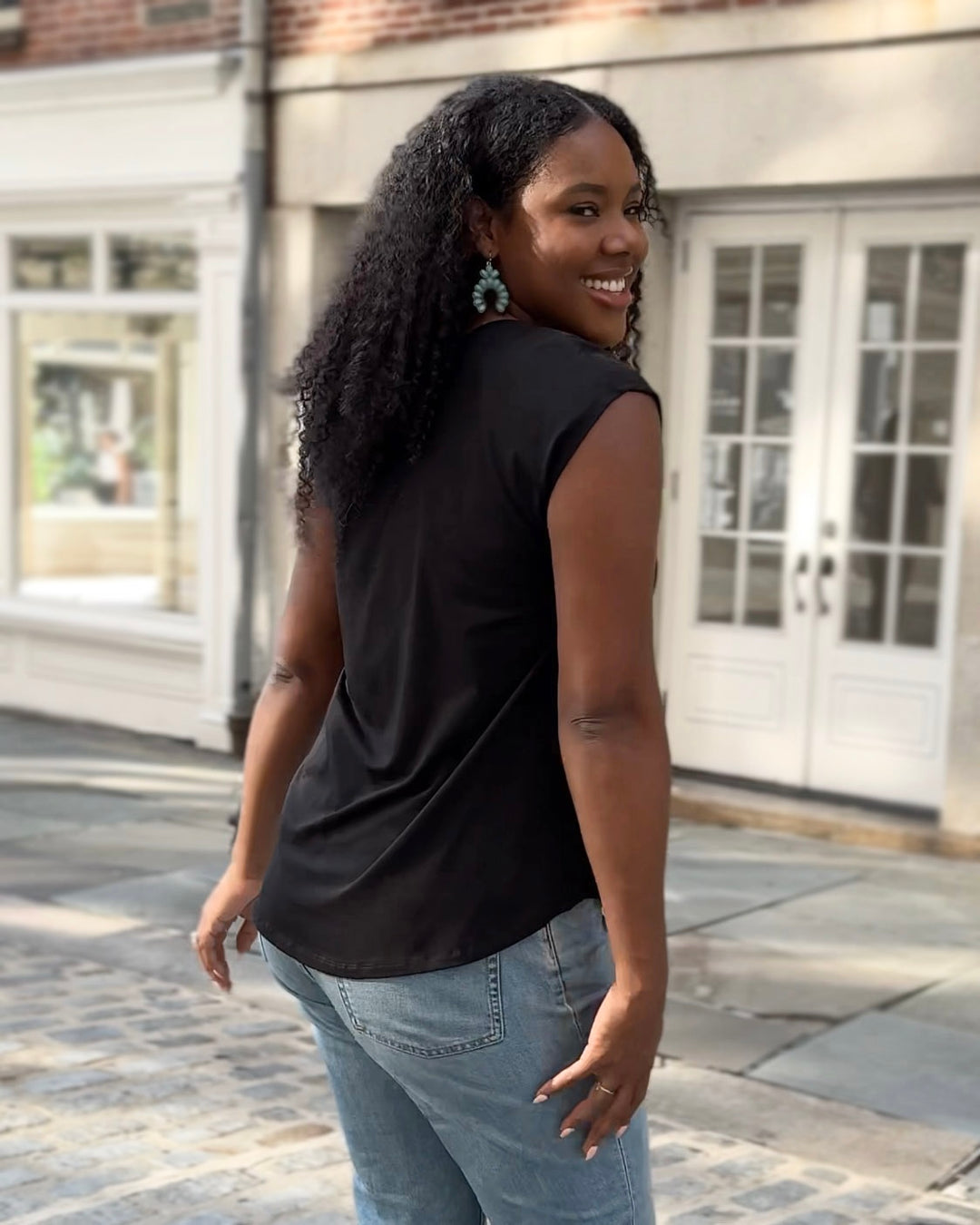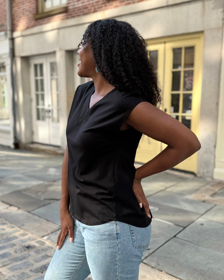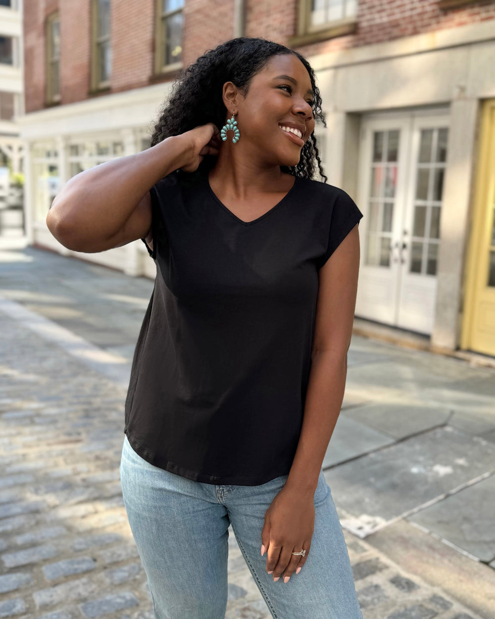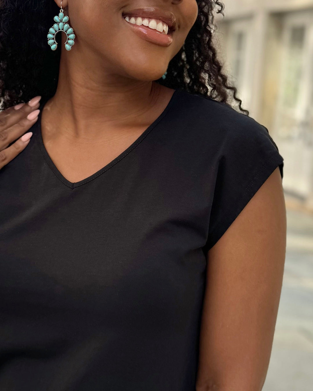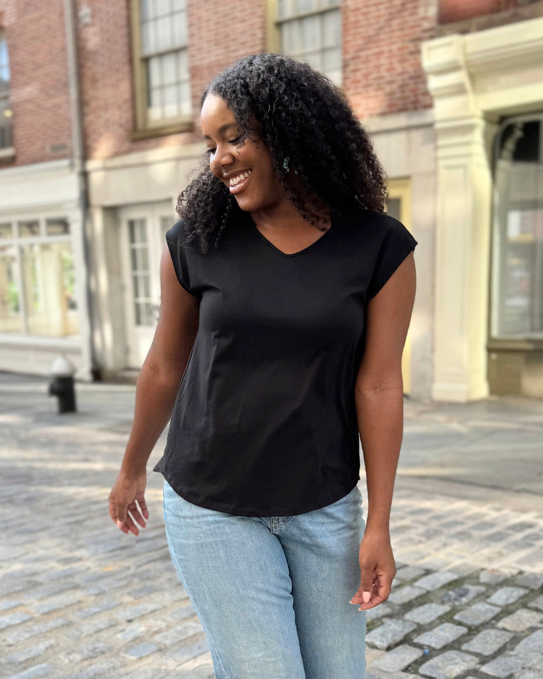 An incredible value for a practical way to support the fight against human trafficking. Enjoy this easy to wear basic V-neck relaxed cut top. The curved hem accentuates your curves.