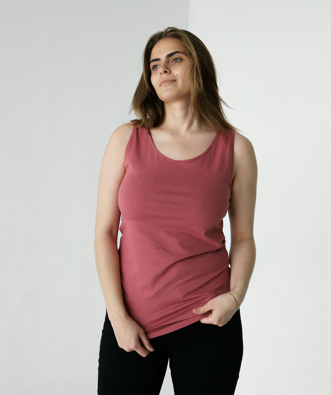 - Gently fitted, but not a body-con fit. Size down if you prefer tighter for a layering tank.
