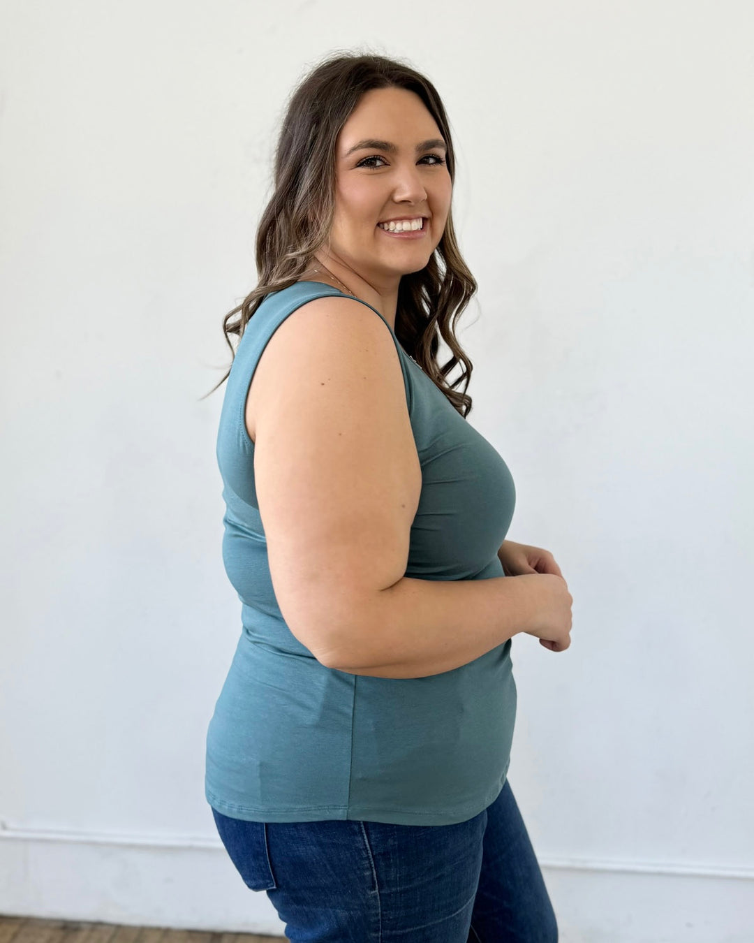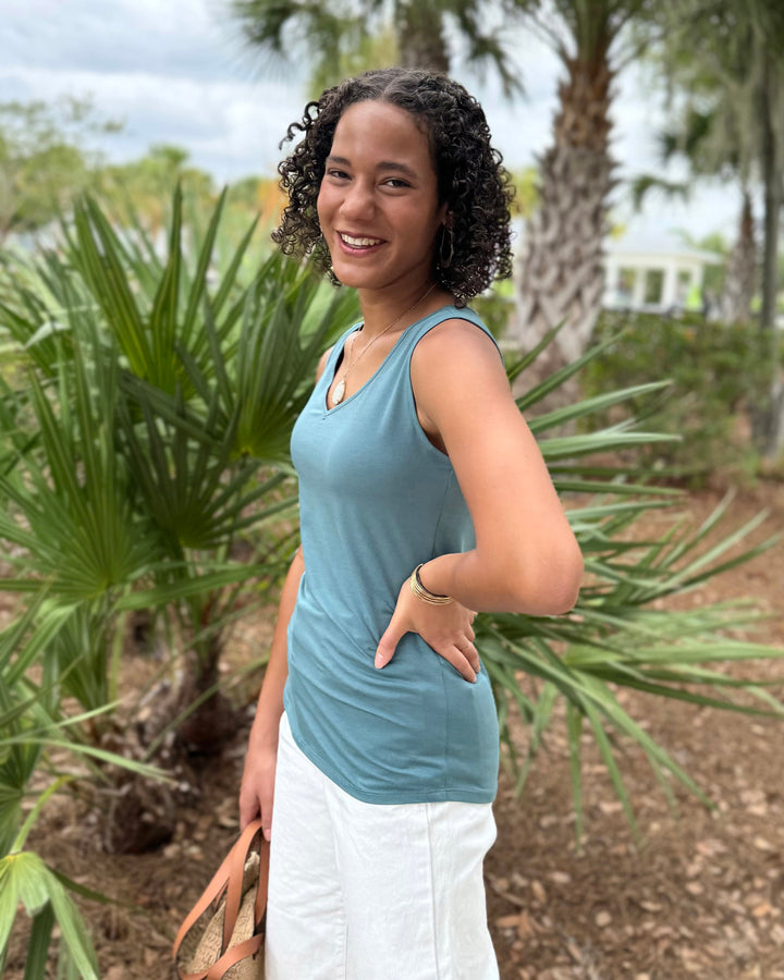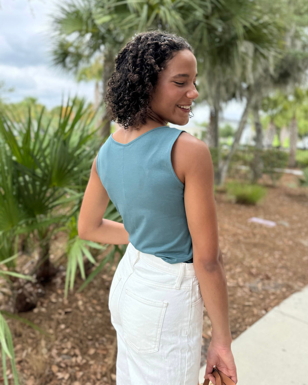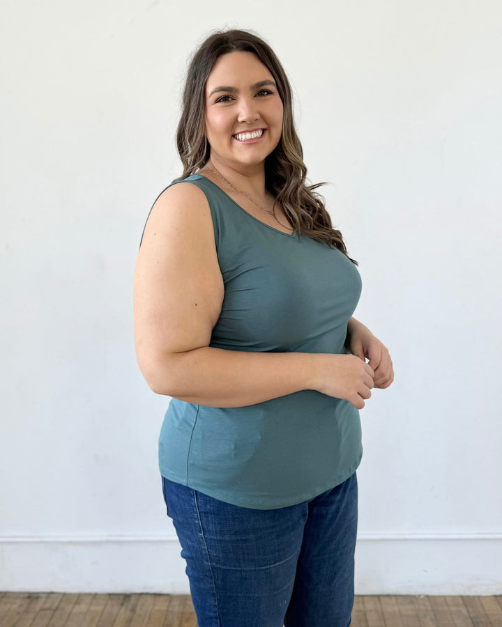 This semi-fitted longer tank is all about the pretty neckline. It's not a sweetheart neckline or a V-neck, but in between. This elegant shape is sure to dress up your basics.