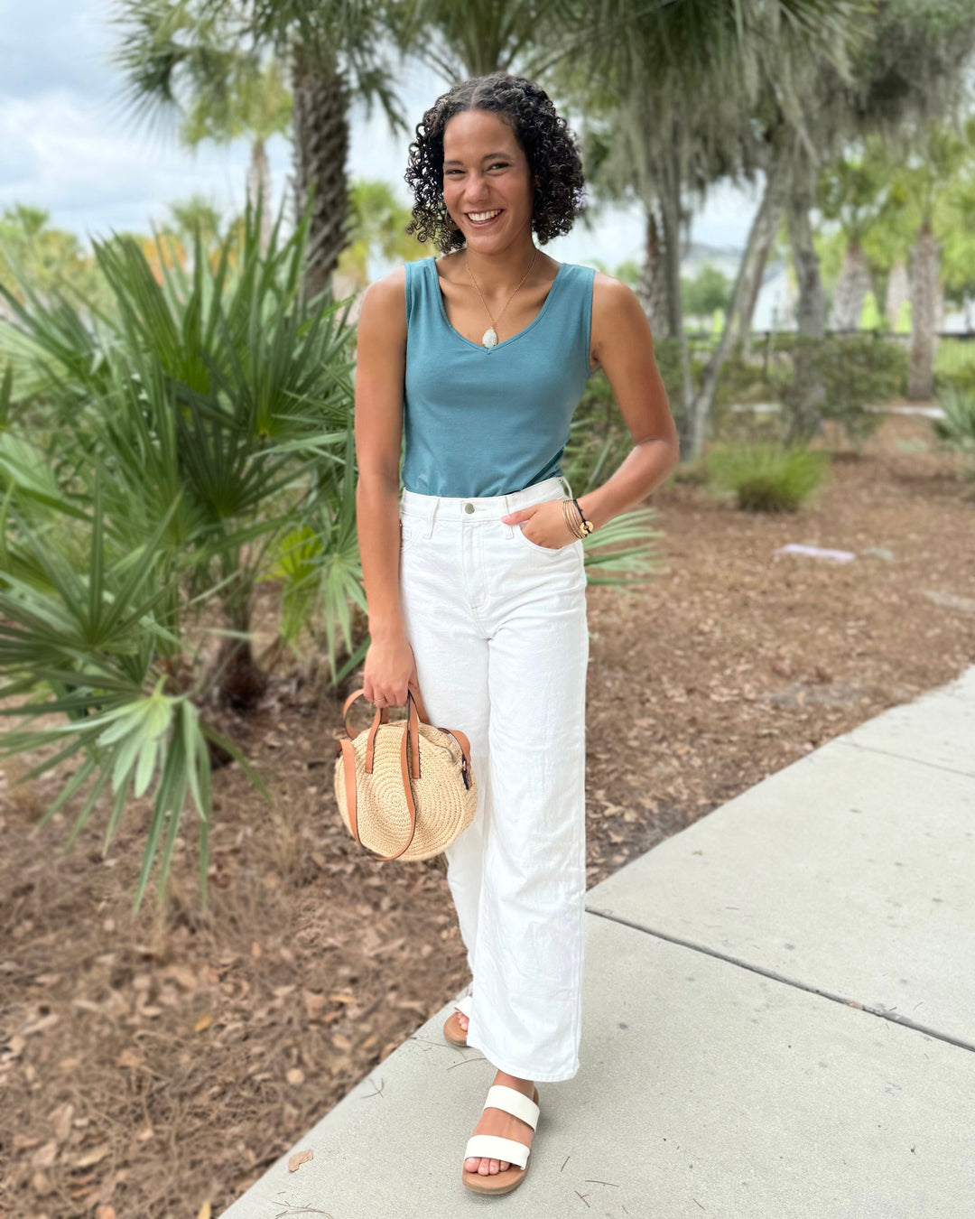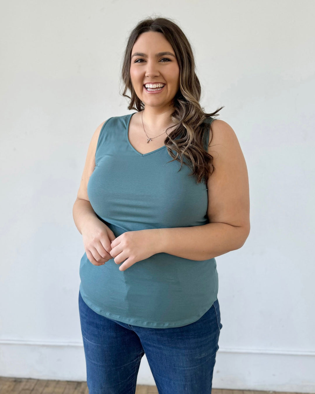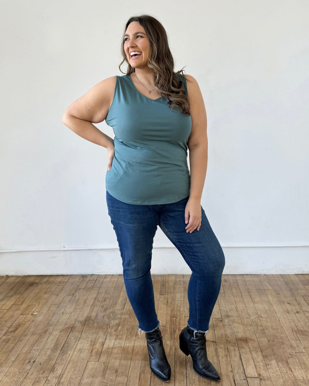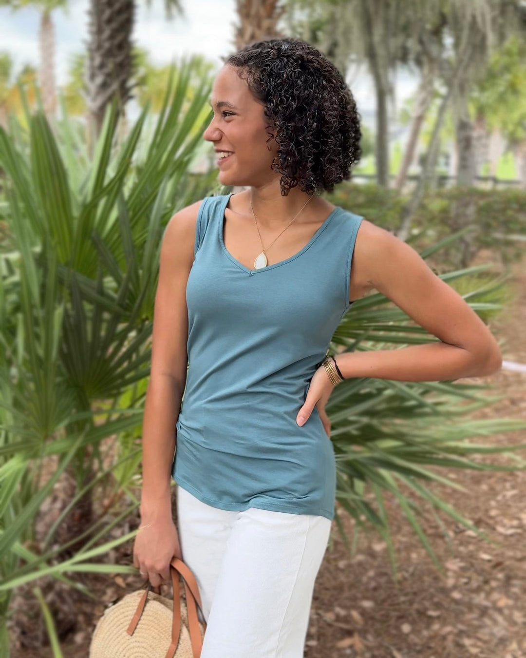 This semi-fitted longer tank is all about the pretty neckline. It's not a sweetheart neckline or a V-neck, but in between. This elegant shape is sure to dress up your basics.