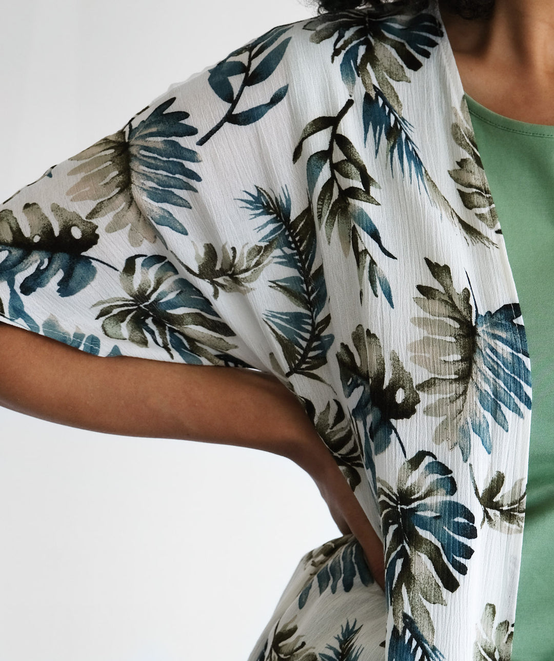Unique palm print on a crinkle gauze, wrinkle-free, woven fabric.