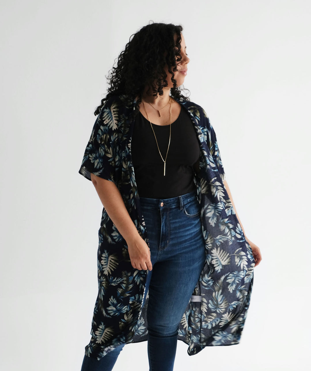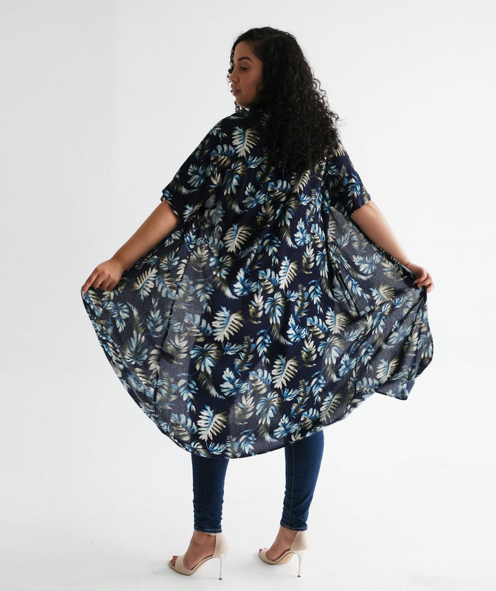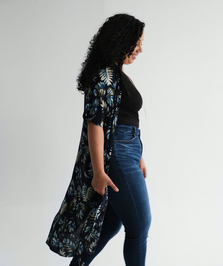 - Intended to be flowy since fabric is non-stretch, and front is open.