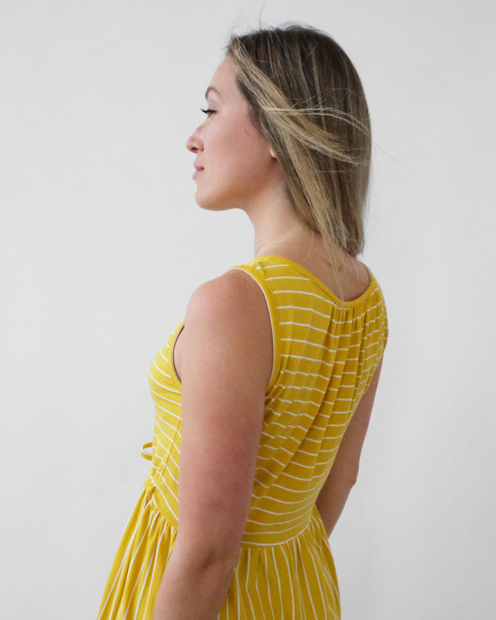 • Bra-friendly. Back neck has gathering to help the fabric glide over your back.