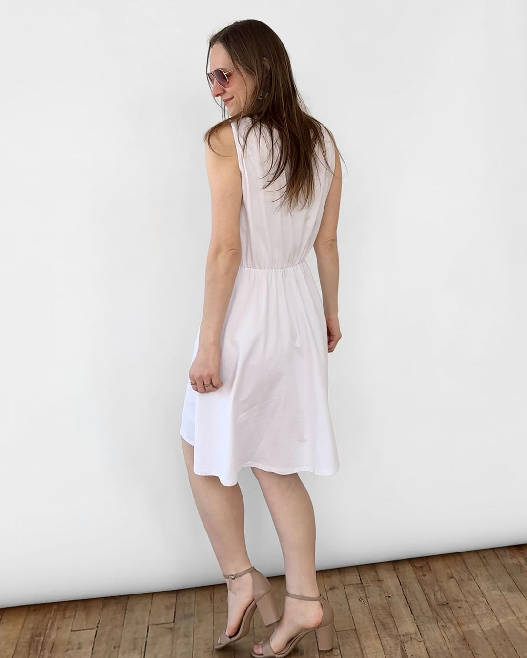 • Don't overthink it.  We have a low return rate overall because most designs are flattering in a size up or down. Our knit fabrics drape in all the right ways!