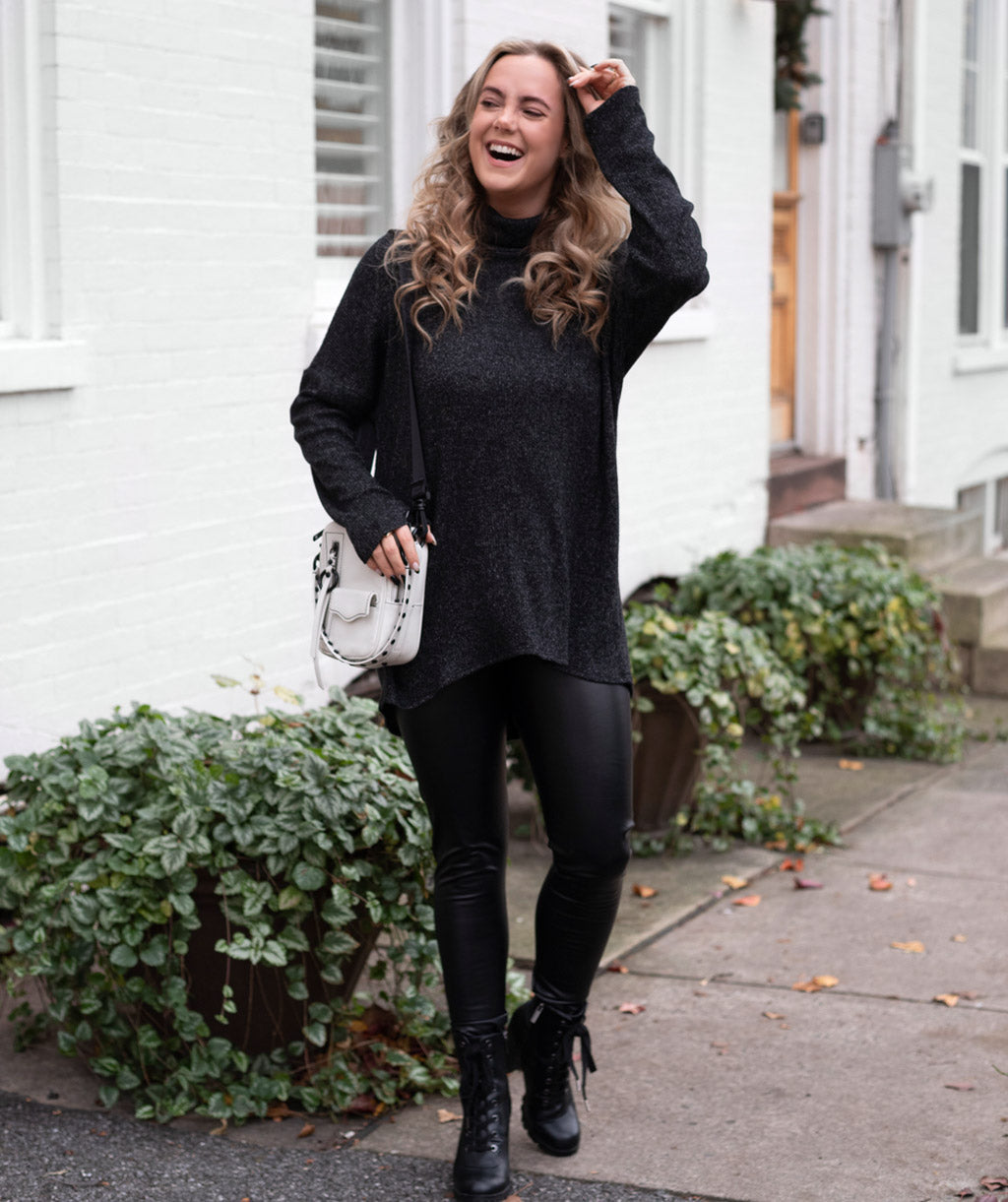 - Legging friendly. Length from top of shoulder to hem is about 30" on the front. Back hem is 3" longer than the front.