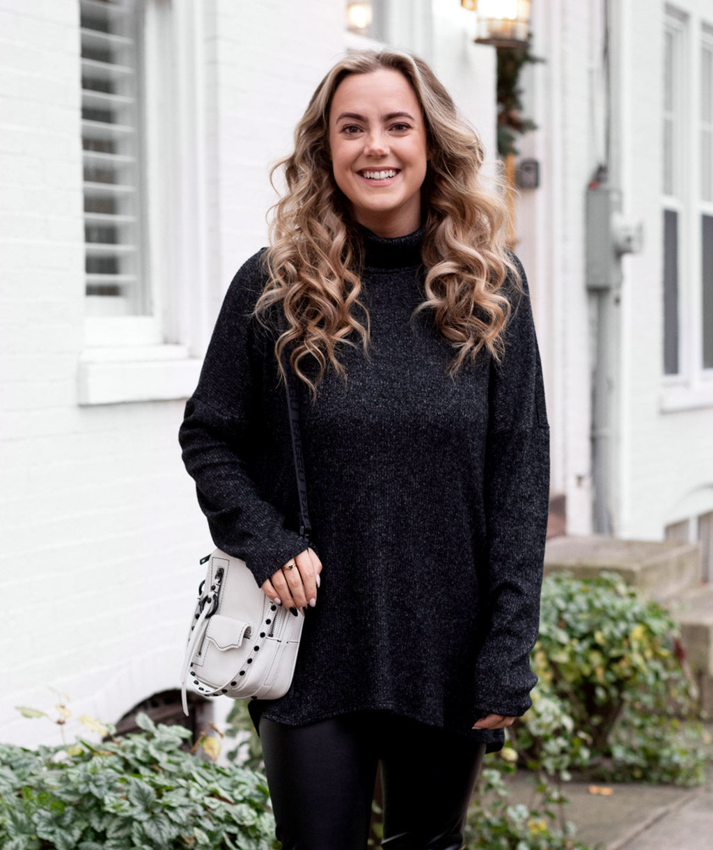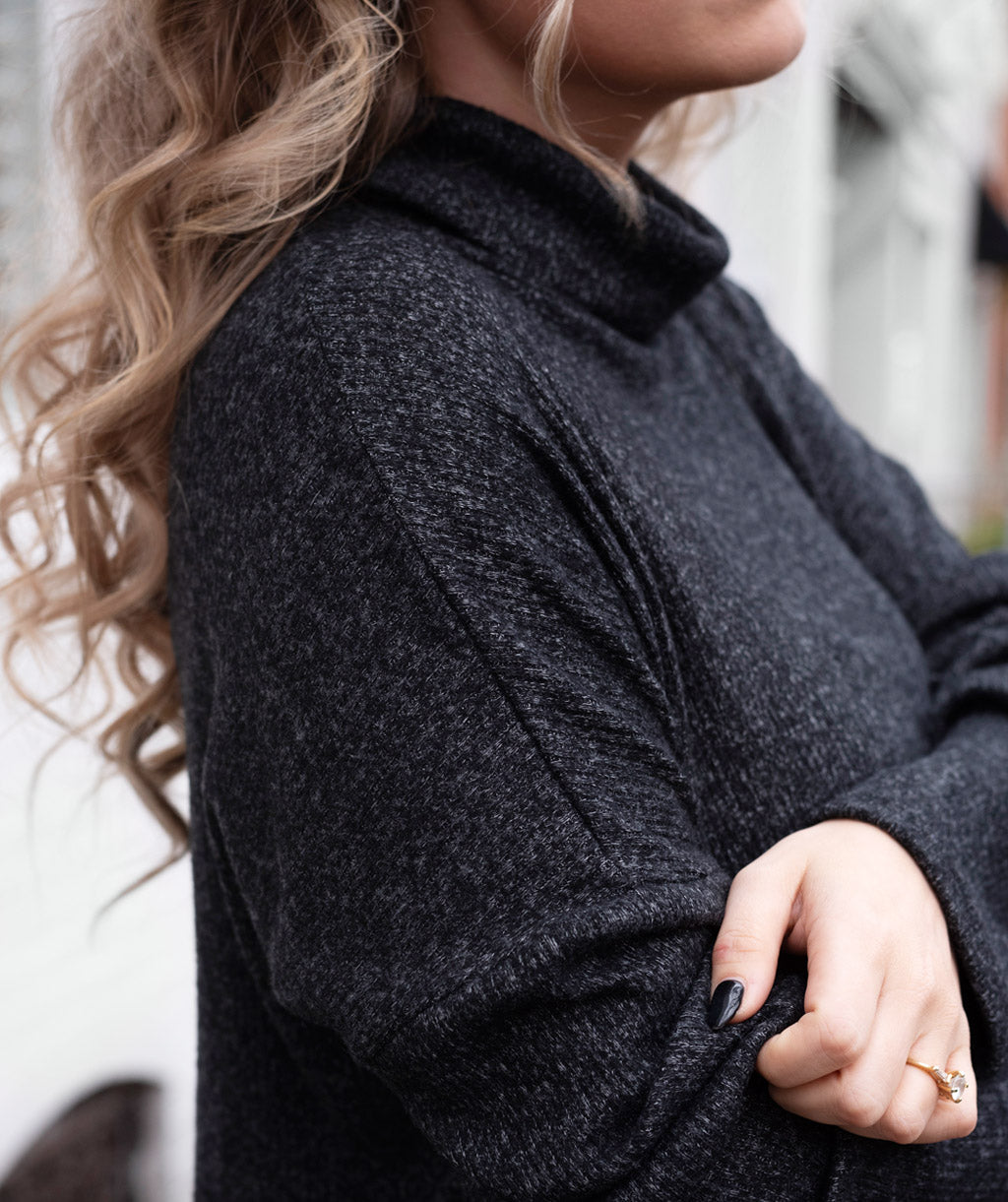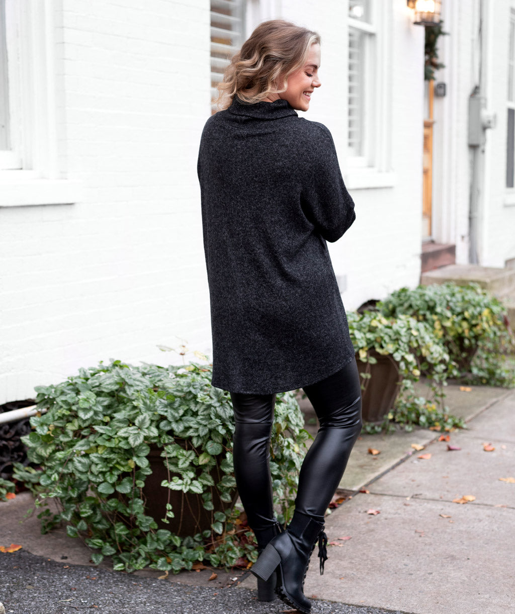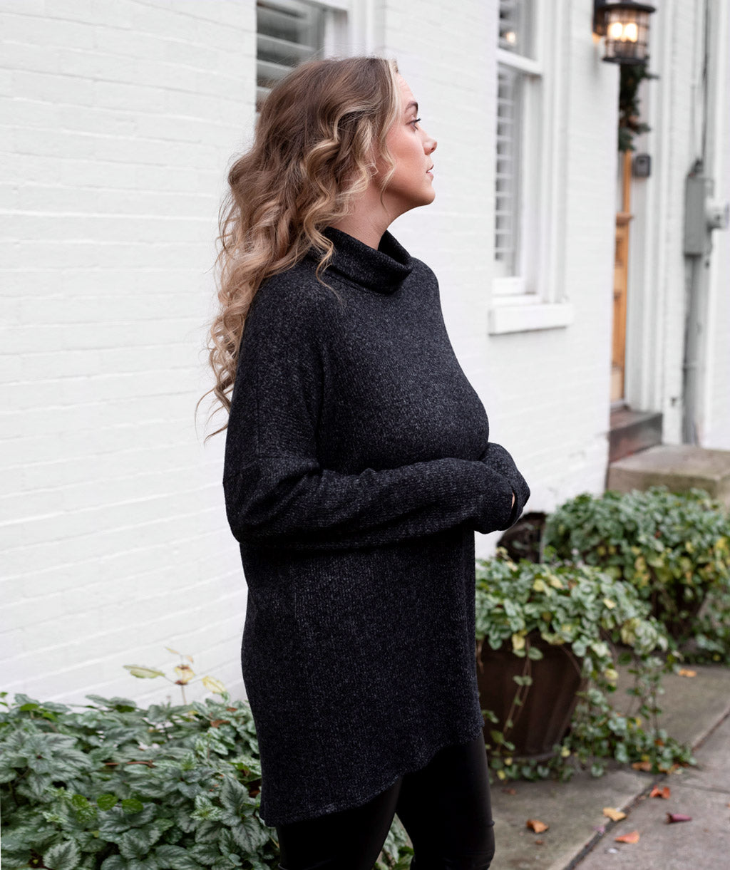 Soft sweater-like rib knit fabric makes this your most cozy tunic. Wear with leggings and boots for an everyday look, then snuggle up with hot tea at home.