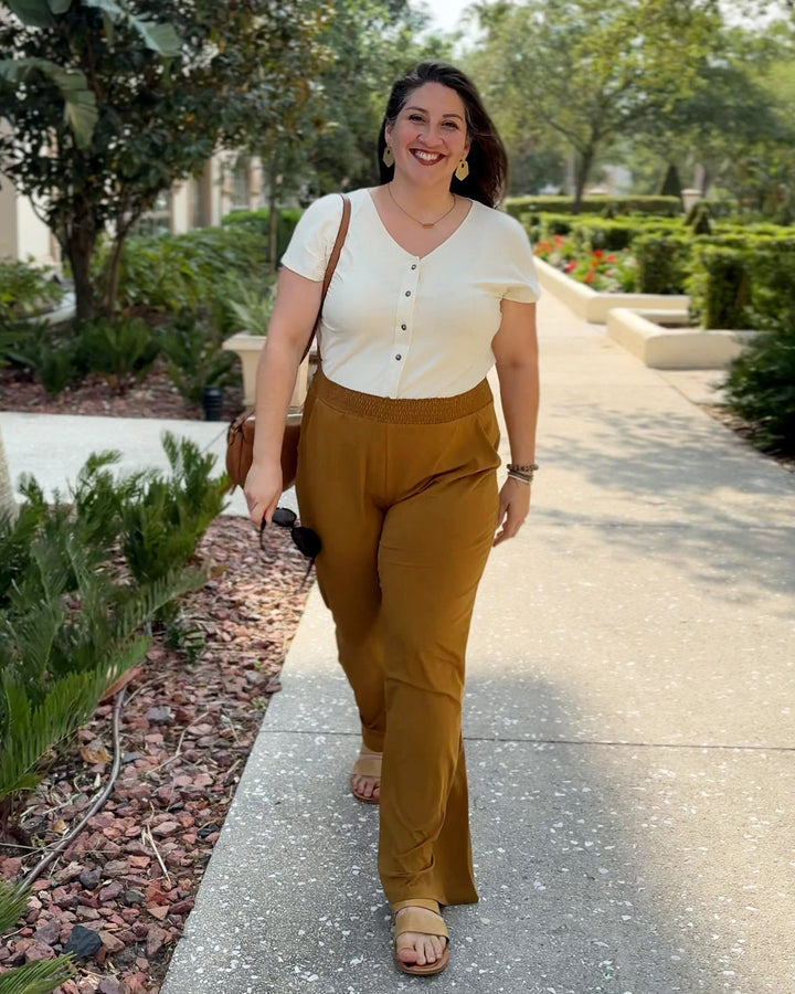 A smocked waistband that is super stretchy and chic! These high-waisted straight leg pants have flat front pockets.